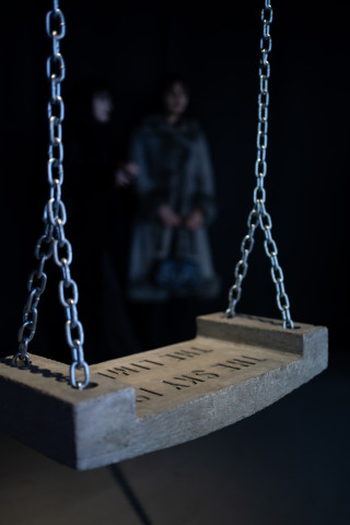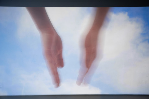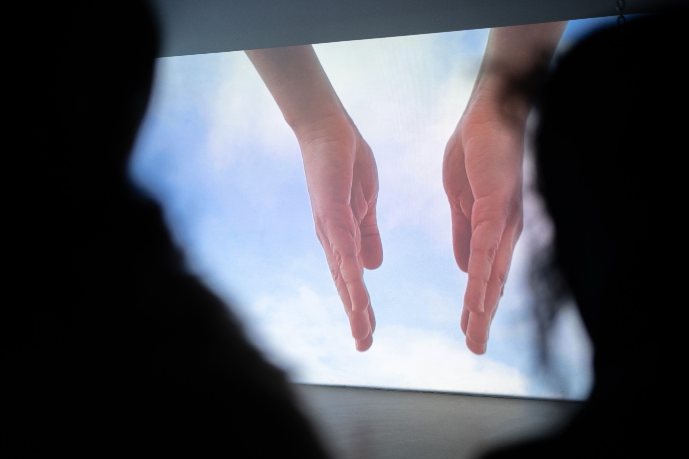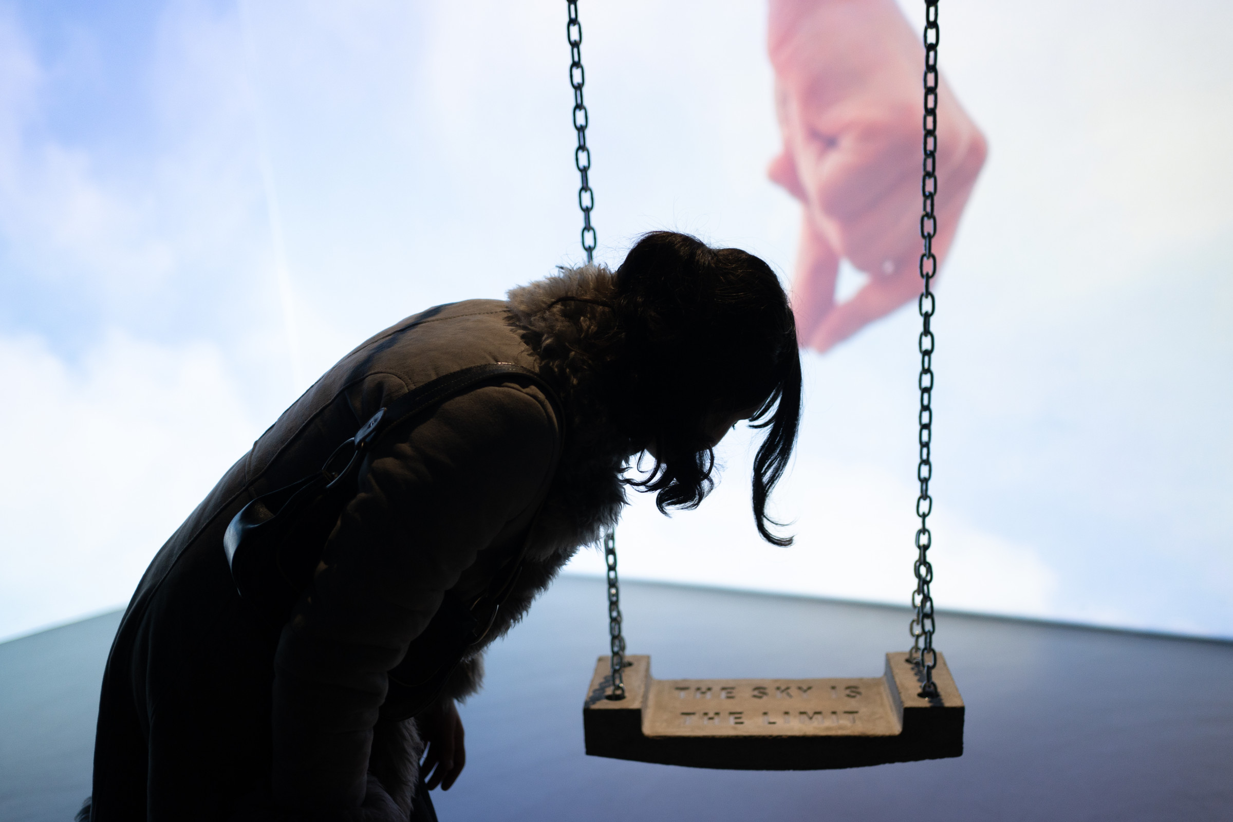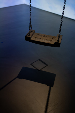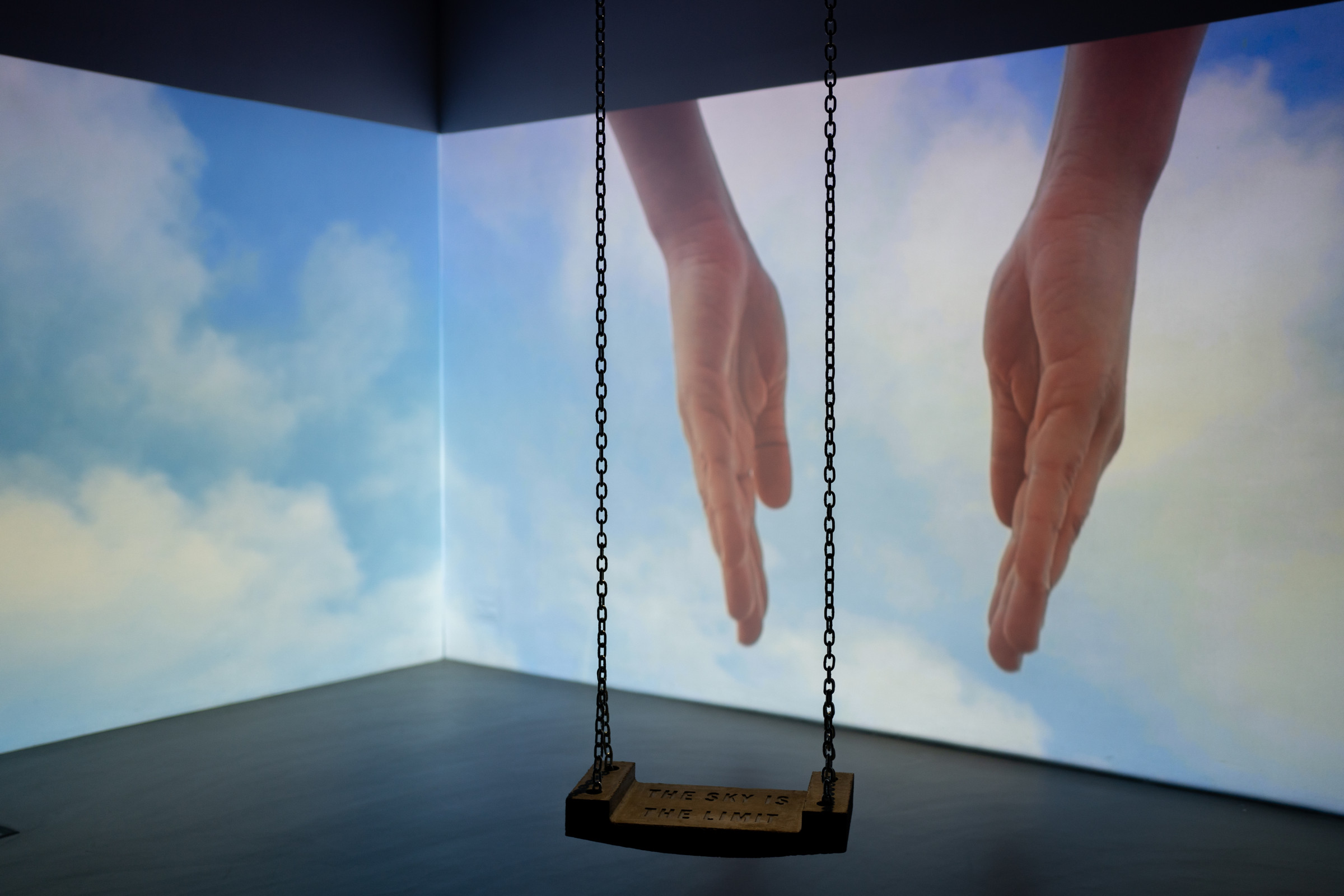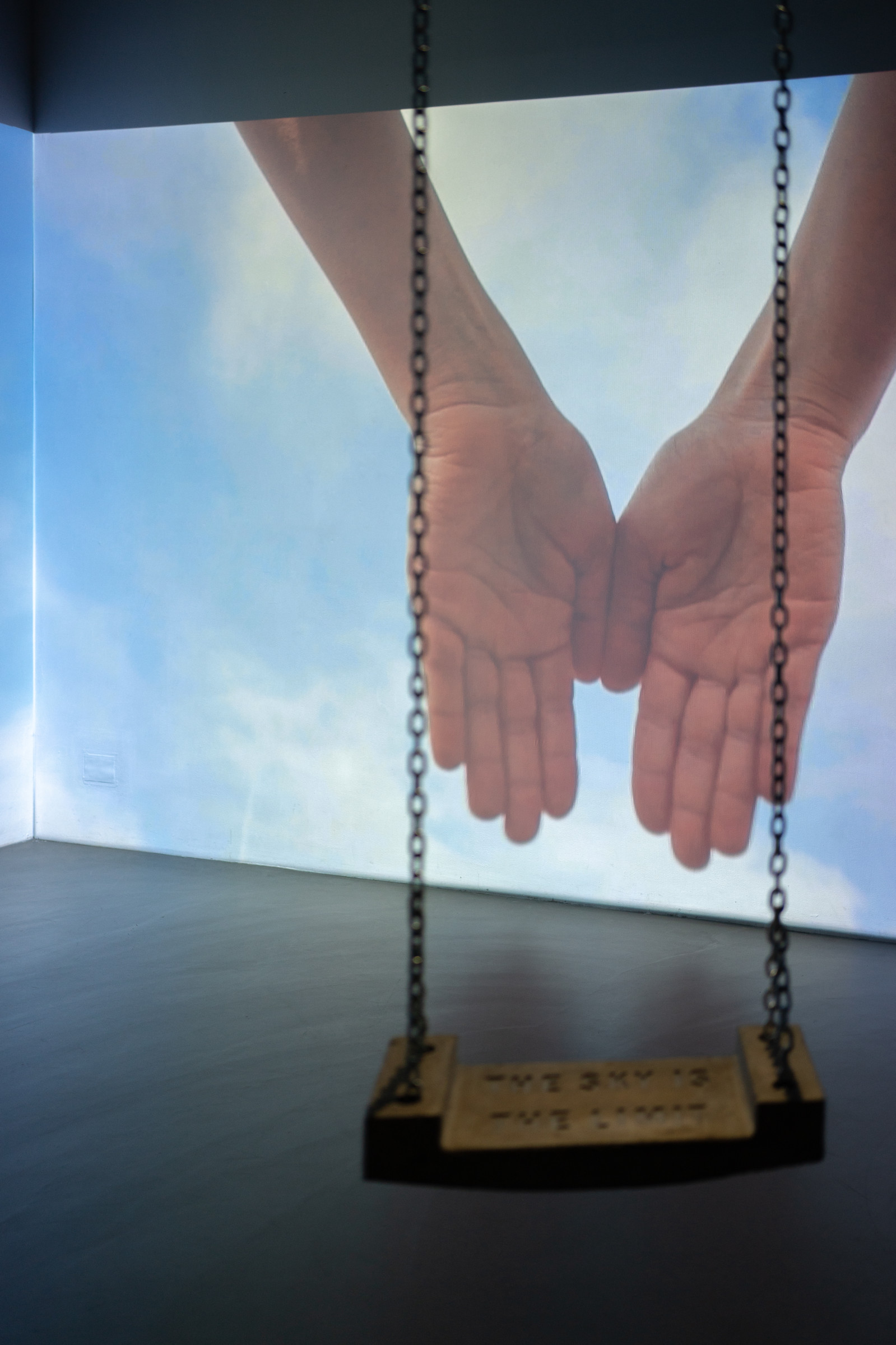 Den Gesang begleitet ein Klatschspiel eines einzelnen Paares Hände, das überdimensional an zwei Wände projiziert wird. Im Hintergrund ziehen Wolken vor blauem Himmel vorbei. Das Spiel wird immer schneller, ebenso der Gesang, bis sich das Klatschspiel verhaspelt und die Stimme im Raum, scheinbar in Richtung Himmel, verliert und verhallt. Im Raum hängt eine Schaukel an Rundstahlketten von der Decke herab. Sie ist aus Beton gefertigt, auf ihrer Sitzfläche findet sich der Imprint „THE SKY IS THE LIMIT“.