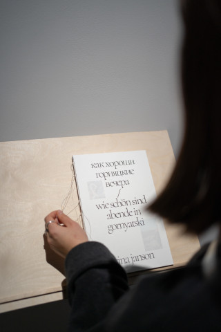 Den Titel des Buches hat Janson letztlich auf der Rückseite eines Fotos entdeckt, welches ihre Großeltern 2002 an ihre Mutter schickten und mit der kurzen Zeile versahen: „wie schön sind abende in gornyatski“. Die Gegenwärtigkeit dieses Satzes ergänzt die visuelle Erzählung um eine narrative, emotionale Ebene und markiert die analoge Fotografie als ein Spurenmedium, was eng mit ihrem Referenten verbunden ist. Sie verweist auf etwas Abwesendes und erweckt zugleich den Eindruck, es sei gegenwärtig. Sie zeigt, dass etwas da war und damit auch, dass es nicht mehr ist.