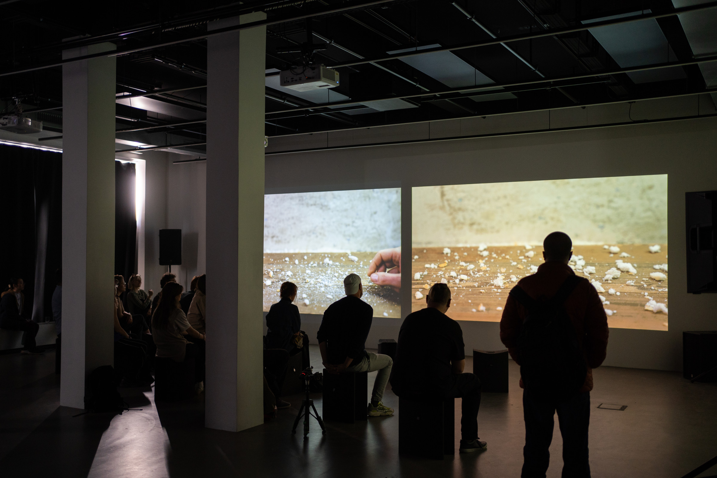 In Crumbs von Karina Marusińska und Marta Śniady sind die vom Boden und der Küchenarbeitsplatte aufgesammelten Krümel Teil einer Installation, die unscheinbare Elemente der Realität – übrig Gebliebenes, Brotpartikel – sichtbar und hörbar macht. Mit einer Spiegelplattform, einer HD-Kamera, einem Bildschirm und Stereoklang erstellt gelangen Brotpartikel und subtile Handbewegungen in das Kameraobjektiv, beeinflussen Farbveränderungen und initiieren dadurch kraftvolle, resonante elektronische Klänge. Diese Krümel sind das, was nach der Sättigung achtlos verworfen wird, und das, was zum Überleben ausreicht. Abwesenheit, Knappheit, Verlust sind das „tägliche Brot“ des Krieges. Krümel als Verkörperung von Resten, Überbleibseln des Verfalls und der Zerstörung. Aber auch die Erhebung von Dingen/Themen/Geschichten, die klein, scheinbar unbedeutend und marginalisiert sind.
