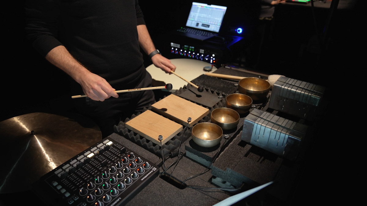 Der Perkussionist Tom De Cock ist von einer Landschaft runder Schlaginstrumente umgeben. Mit minimalen Bewegungen verändert er die Klangfarben hängender Rahmentrommeln und Becken, die jeweils von einem eigenen kleinen elektronischen Gerät angetrieben werden. Polyrhythmische Klangwolken, perkussive Eruptionen und elektronisch transformierte Schlagzeug-Cluster erinnern an die Werke des großen Meisters Iannis Xenakis.