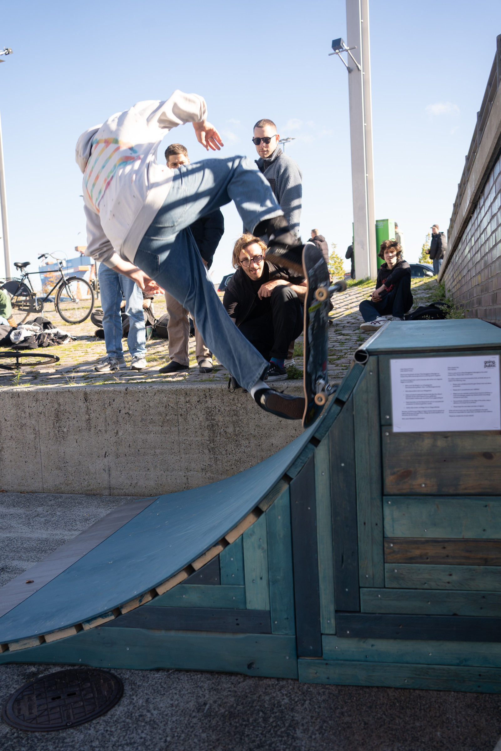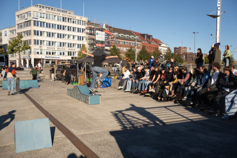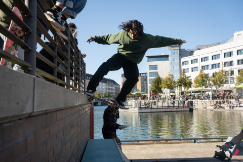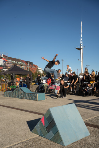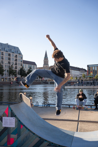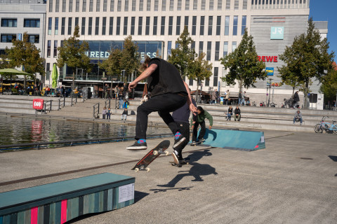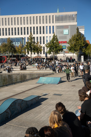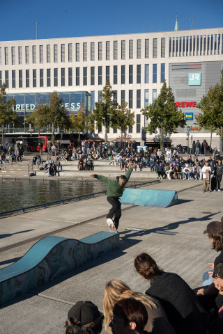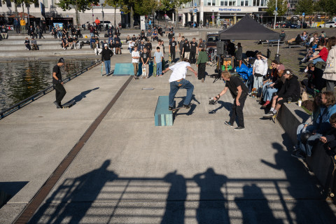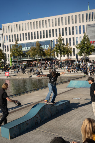 Zu Eröffnung und Finissage wird die Skulptur zur Bühne für Skate Performances professioneller Skater*innen, die die „Welle“ für ihre Kunst nutzen.