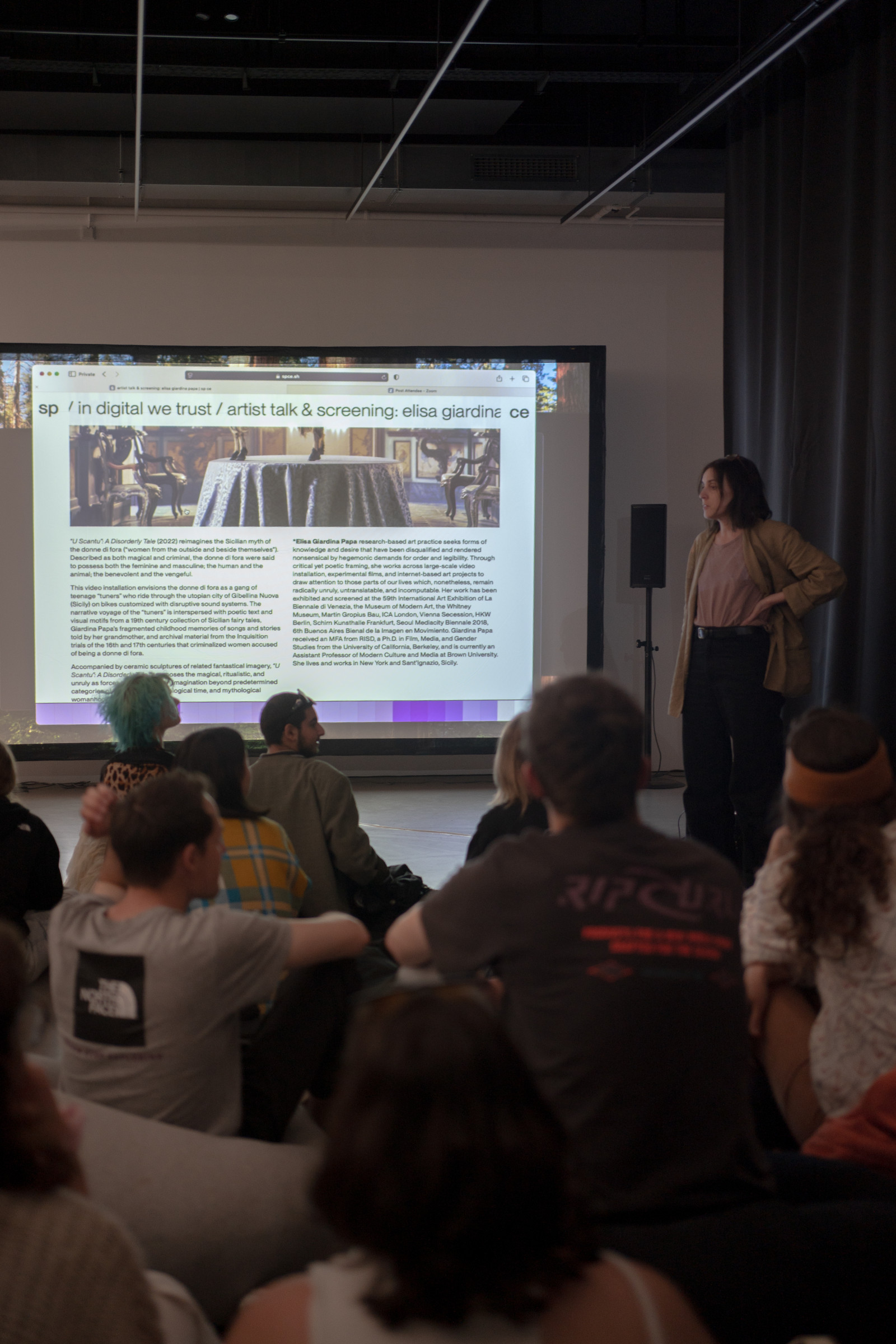*Elisa Giardina Papas forschungsbasierte Kunstpraxis sucht nach Formen des Wissens und des Begehrens, die durch hegemoniale Forderungen nach Ordnung und Lesbarkeit disqualifiziert und unsinnig gemacht wurden. Durch kritische und zugleich poetische Rahmung arbeitet sie mit großformatigen Videoinstallationen, Experimentalfilmen und internetbasierten Kunstprojekten, um die Aufmerksamkeit auf jene Bereiche unseres Lebens zu lenken, die dennoch radikal widerspenstig, unübersetzbar und unberechenbar bleiben.
