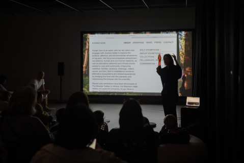 Kyriaki Goni (Athen, GR) arbeitet mit digitalen und physischen Medien und verbindet CGI-Videos, Textilien, Zeichnungen, KI, Ton, Websites und Skulpturen. Ihre Installationen untersuchen die politischen, affektiven und ökologischen Facetten der Big Tech-Branche. Sie stellte in Einzelausstellungen in der Public Gallery, London, The Breeder Gallery, Athen, Onassis Stegi, Athen, Blenheim Walk Gallery, Leeds und im Kunstverein Ost, Berlin, SixtyEight, Kopenhagen, aus, sowie in Gruppenausstellungen: im Bozar Brüssel, Art Basel Video, Serpentine Cinema, EMST Athen, Kunsthalle Trondheim, Kunsthalle Mannheim, 13. Shanghai Biennale, 8. Gherdeina Biennale, 2. Warschauer Biennale, transmediale2020 usw. Zu den Preisen und Stipendien gehören: ECHO S+T+Arts2024, Nominierung für den Human AI Art Award 2024, Nominierung für S+T+Arts 2023, Nominierung für den Ducato Prize 2023, The New New Allianz Fellowshop, INSPIRE2020 MOMUS Griechenland, ARTWORKS2018 SNF. Sie hat an folgenden Residenzen teilgenommen: Onassis ONX (2024) Onassis AiR (2023), Ars Electronica Telekom Art Collection (2021), Delfina Foundation (2019). Kyriaki hat einen MA in Digitaler Kunst, einen BFA in Zeichnen und Bildhauerei (Hochschule der Schönen Künste Athen) und einen M.Sc. in Kulturanthropologie (Universität Leiden).