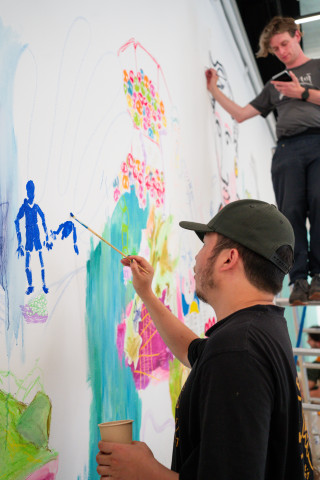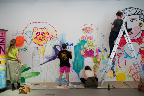 Im Rahmen der Ausstellung wird der spce zu einem Begegnungsraum. Die Gemeinschaft, die entstanden ist, wird eingeladen, mit einer ganzen Reihe an Veranstaltungen, zu feiern. Neben Konzerten, Merchandise, Artist Talks, Launches und Workshops steht im Zentrum eine gemeinsam gefertigte Wandzeichnung, die prozesshaft über die Zeit des Projektes den Raum einnimmt.