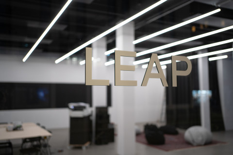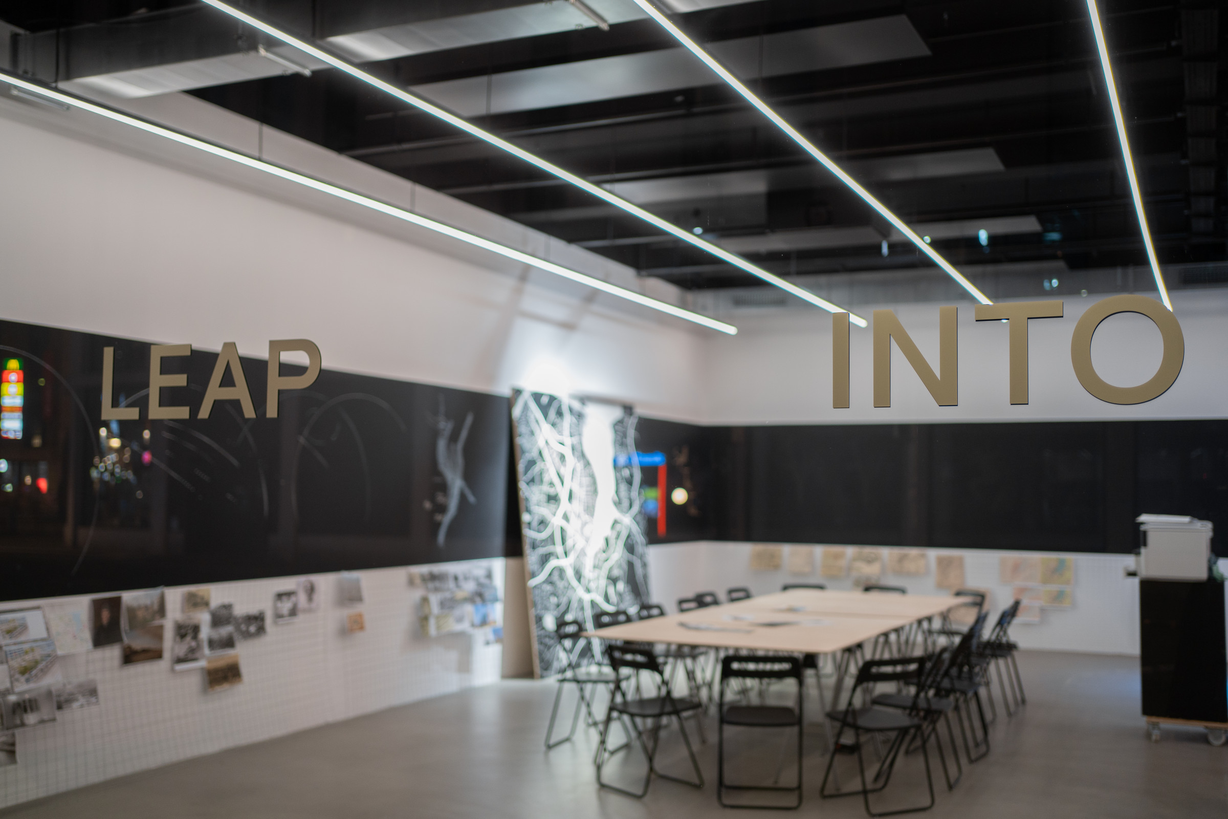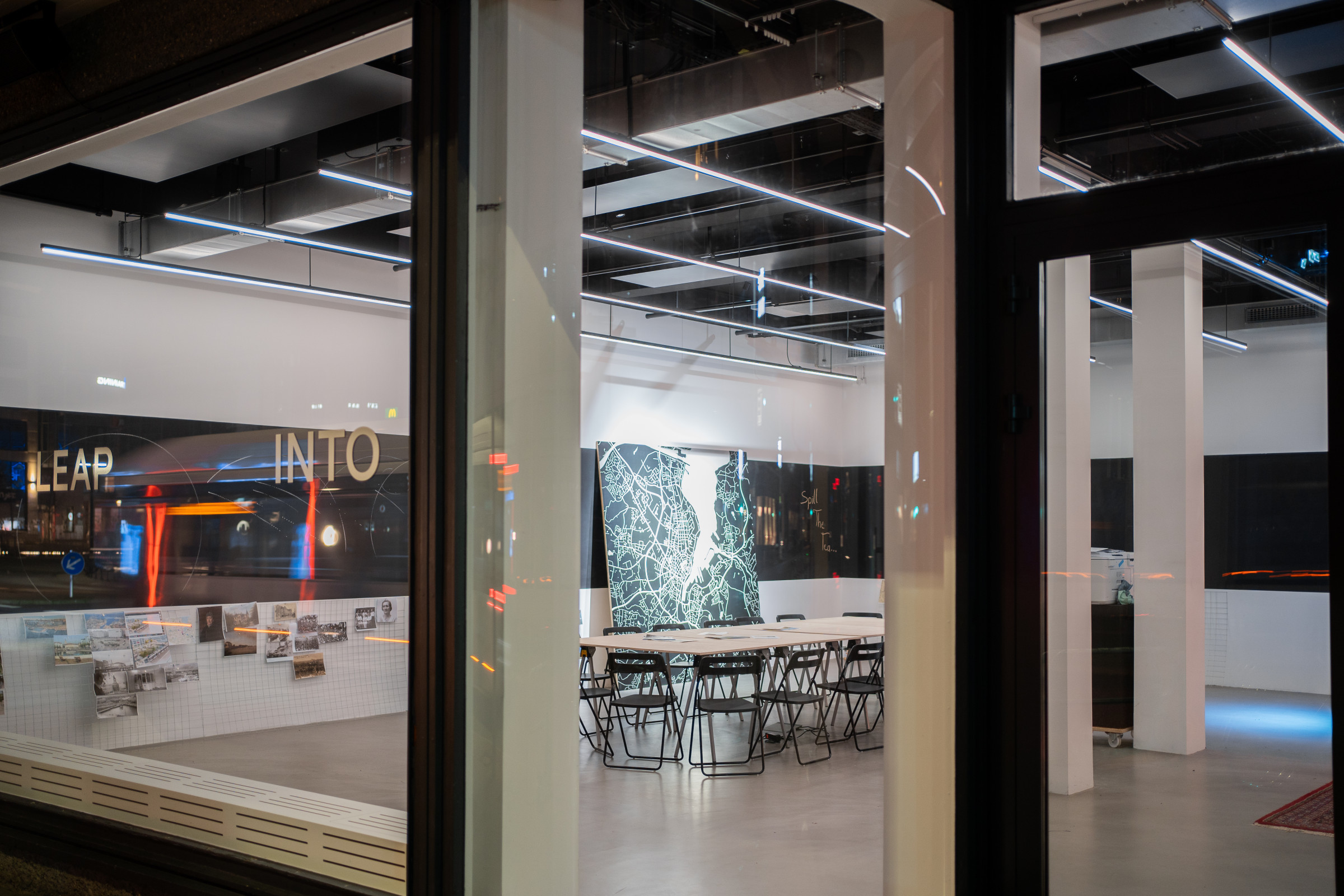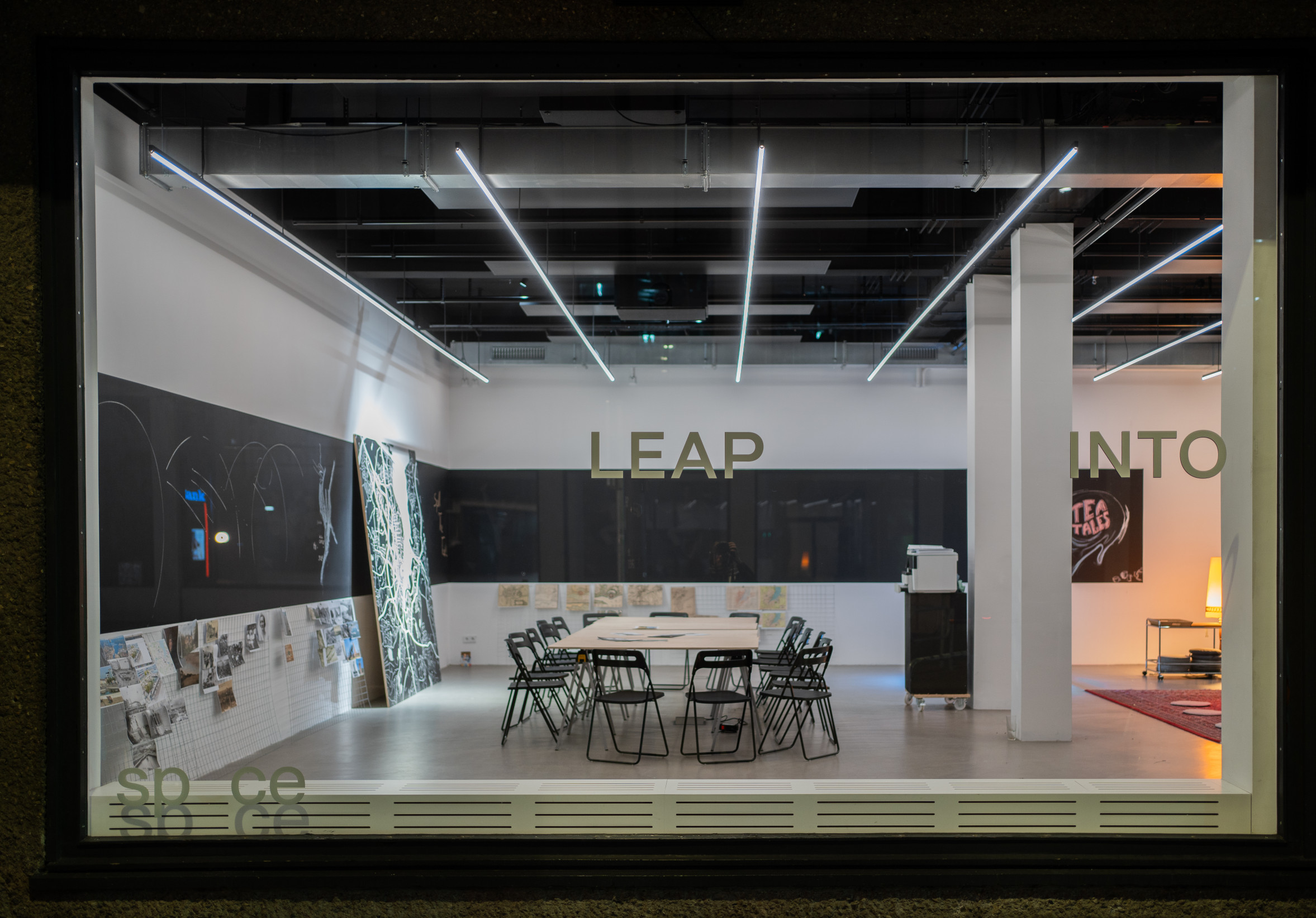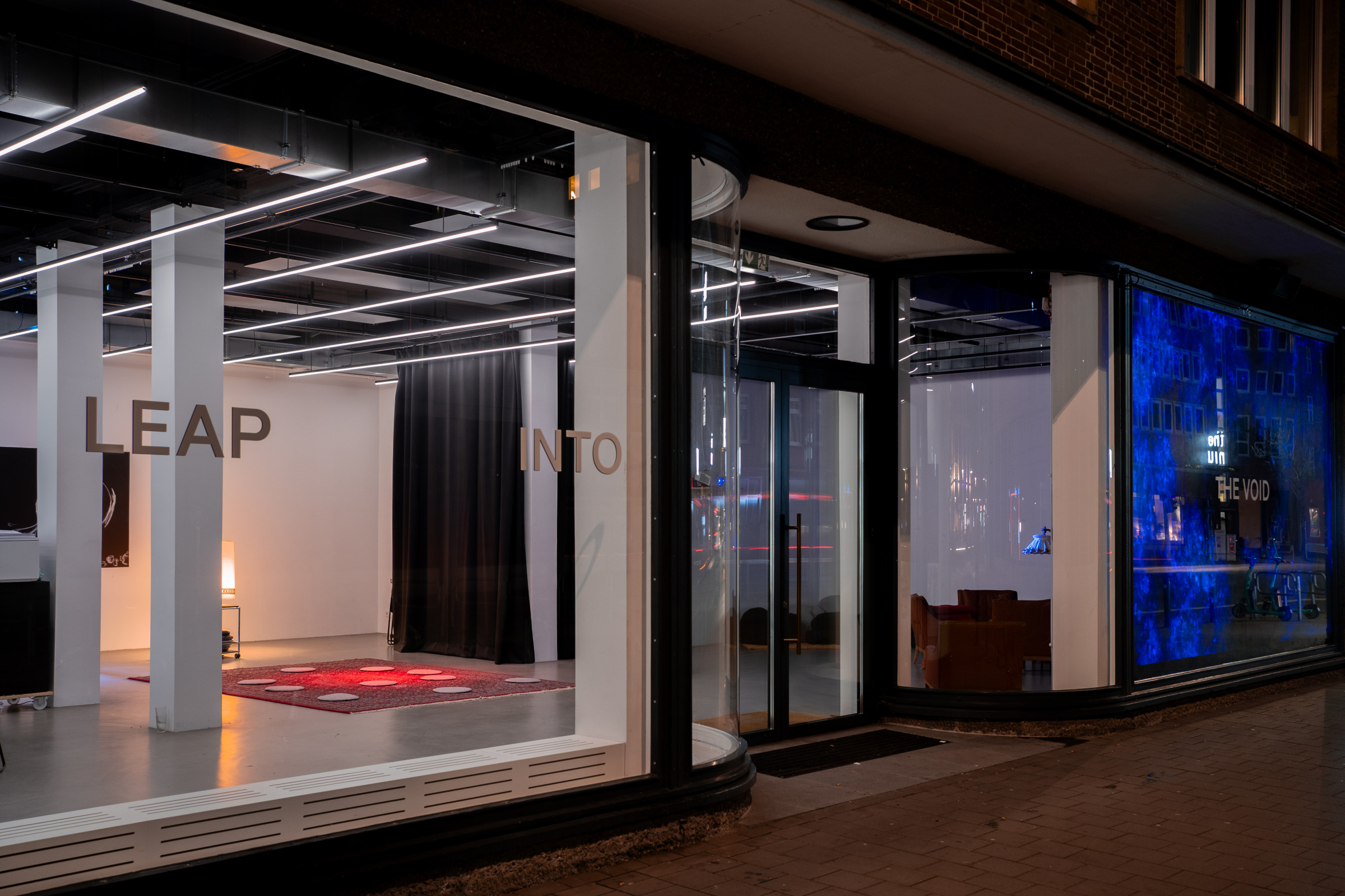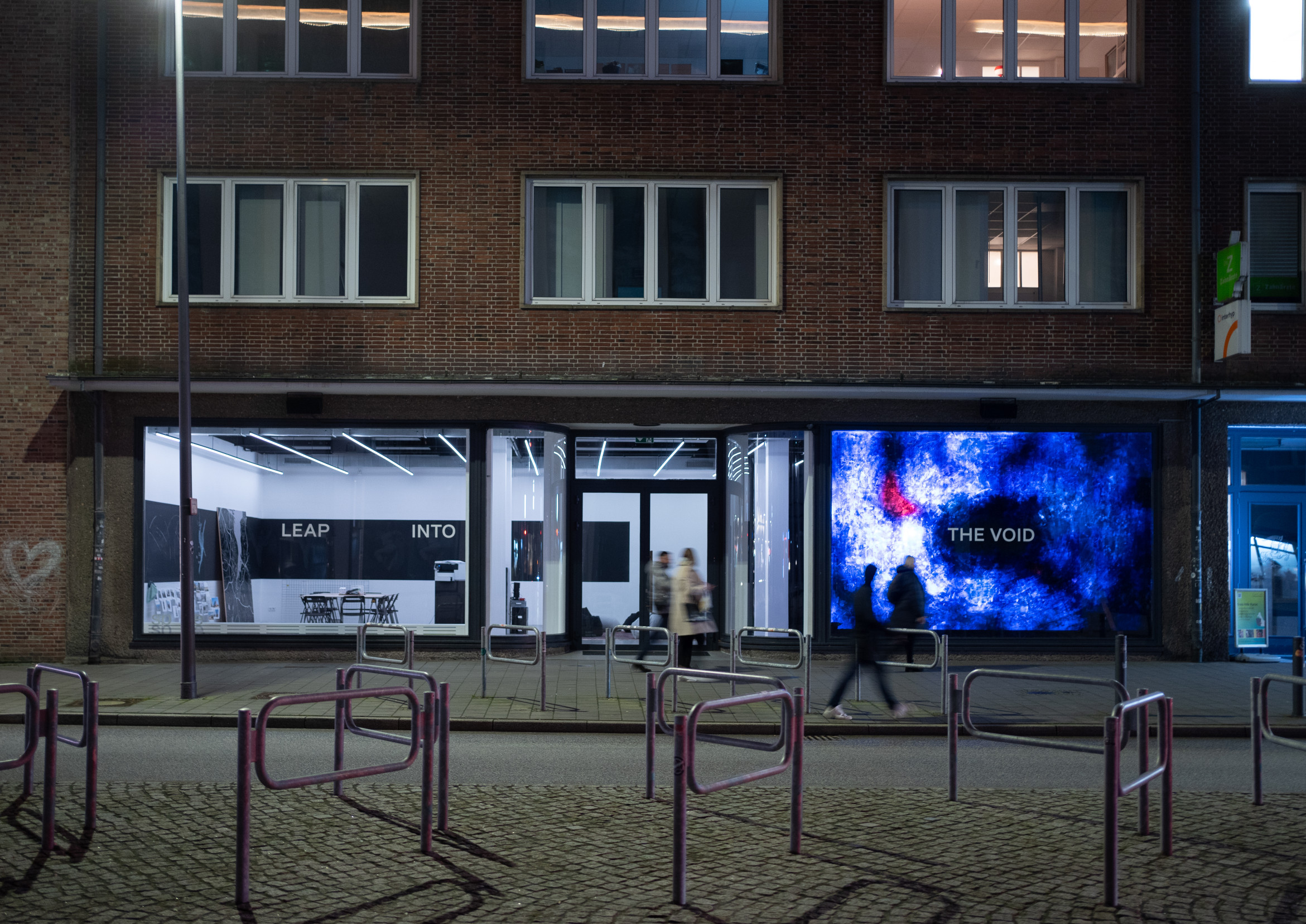 Die Installation LEAP INTO THE VOID von Kaspar Pansegrau erstreckt sich über die volle Fensterfront des sp ce | Muthesius und wurde eigens dafür konzipiert. Die Grundidee des prozessorientierten Projekts aufgreifend adressiert sie die Vorbeigehenden, den Sprung ins Leere zu wagen.