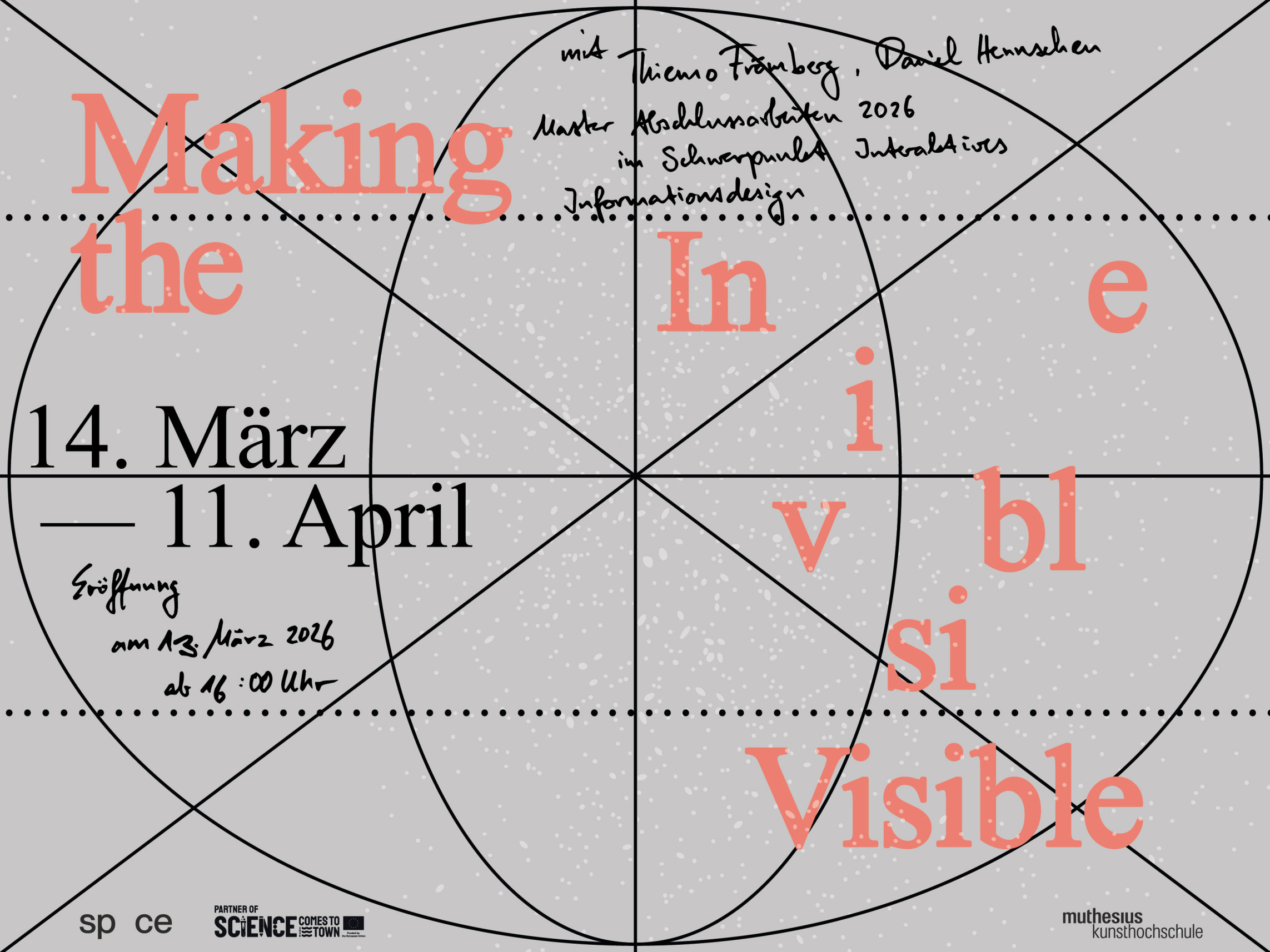 Die Ausstellung „Making the Invisible Visible“ präsentiert zwei Master-Thesisprojekte, die exemplarisch zeigen, wofür dieser Studiengang steht: das Unsichtbare sichtbar, erfahrbar und erzählbar zu machen. Durch interaktive, mediale Exponate werden komplexe Forschungsprozesse und abstrakte Daten in sinnlich zugängliche Formen übersetzt, in denen sich Wahrnehmen und Verstehen verbinden. So entstehen Visualisierungen, die nicht nur informieren, sondern als gestalterische Setzungen eigene Bilderwelten eröffnen und im Erleben der Besucher*innen weiter resonieren.