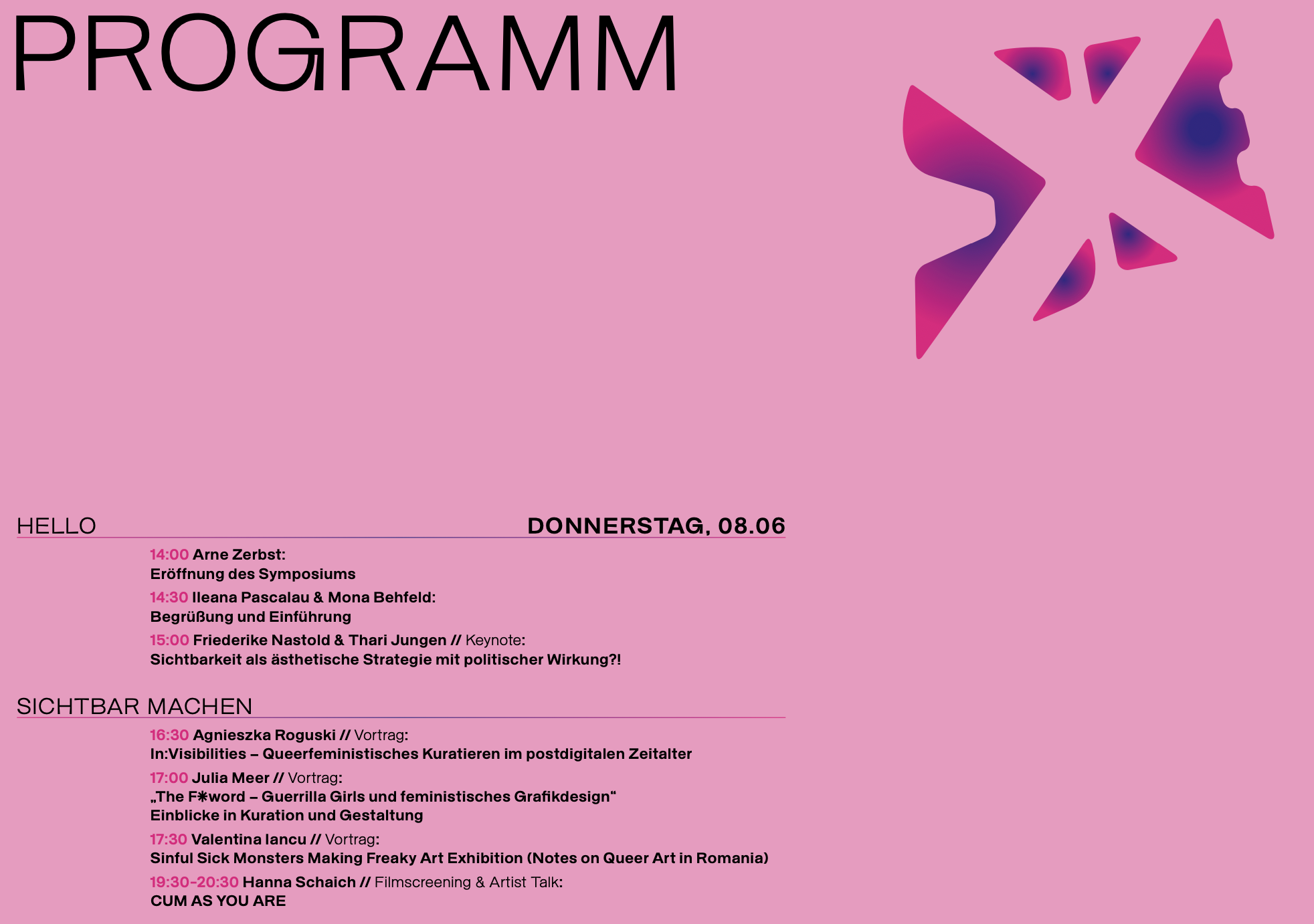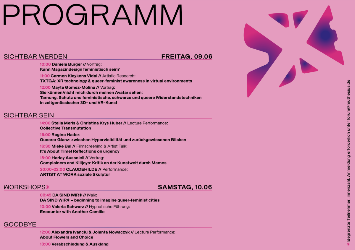 Das von Professorin Dr. habil. Christiane Kruse, Ileana Pascalau und Mona Behfeld in Kooperation mit Sven Christian Schuch veranstaltete Symposium öffnet sich dem komplexen Problemfeld Sichtbarkeit aus der Perspektive queer_feministischer Kunst und Design. Das Thema wird in diversen Formaten behandelt: in Vorträgen, (Lecture) Performances, Filmscreenings und Workshops.