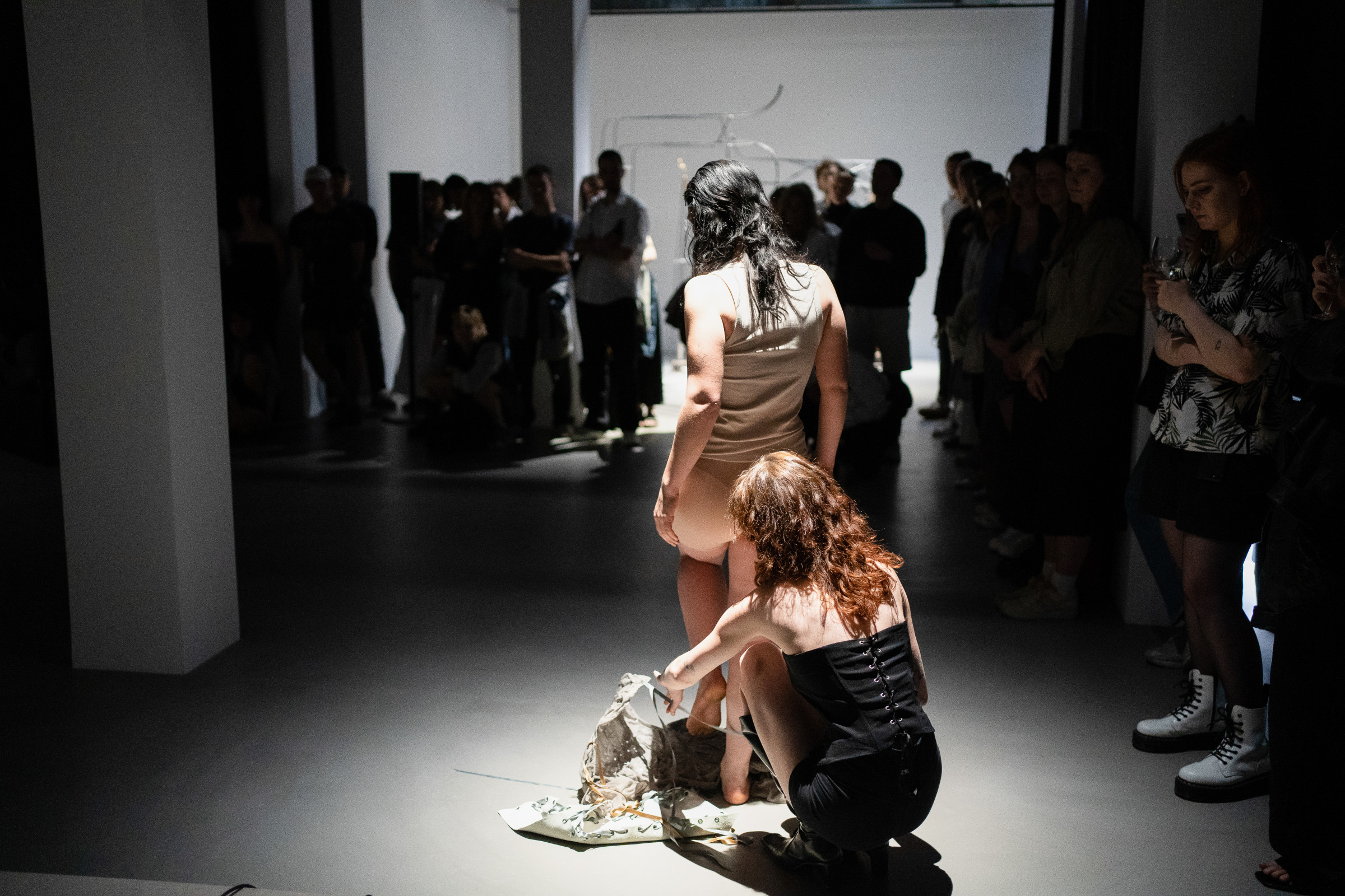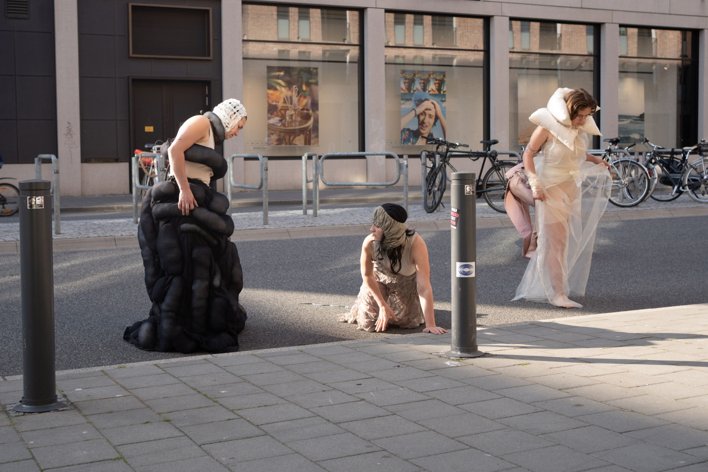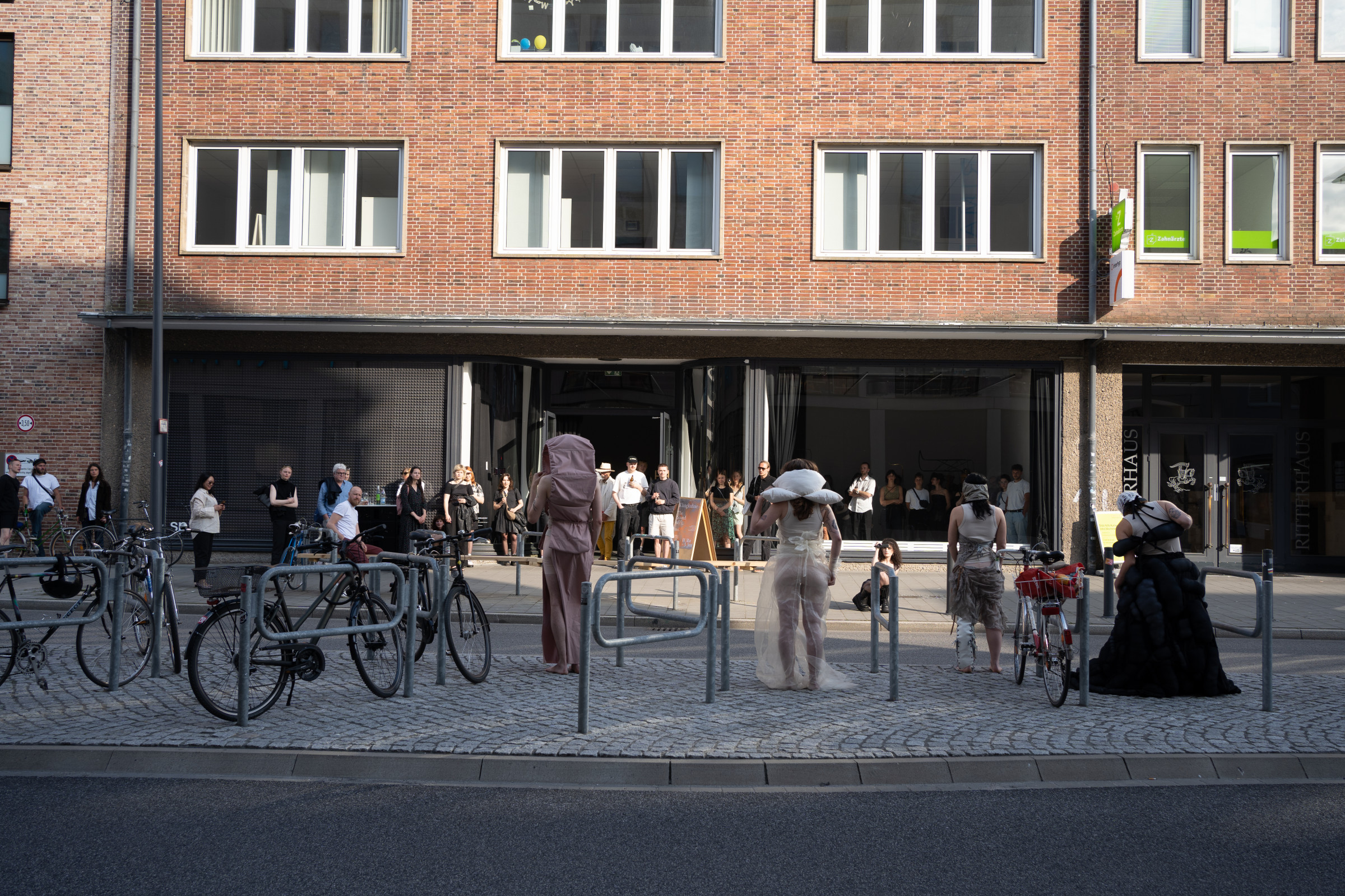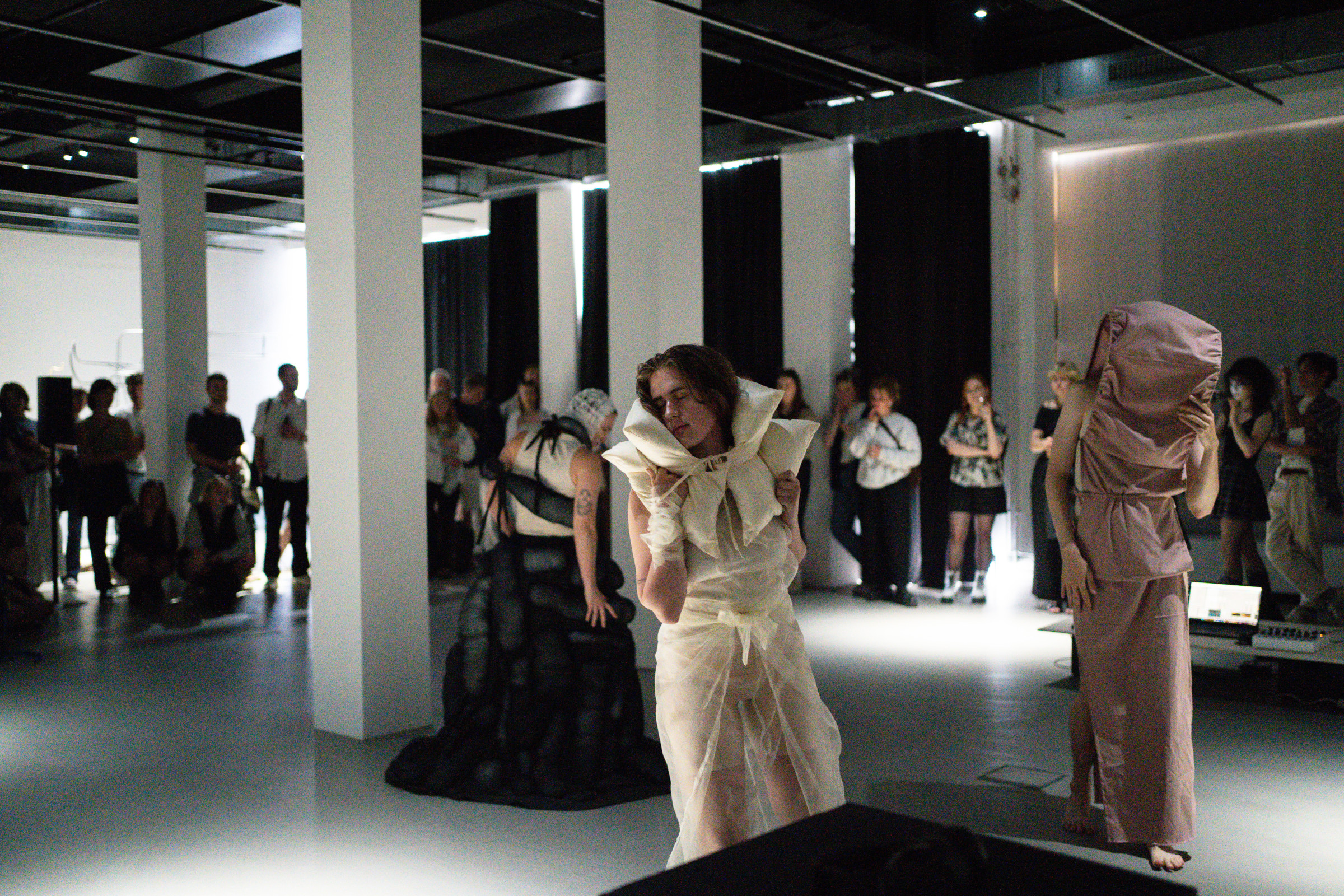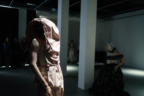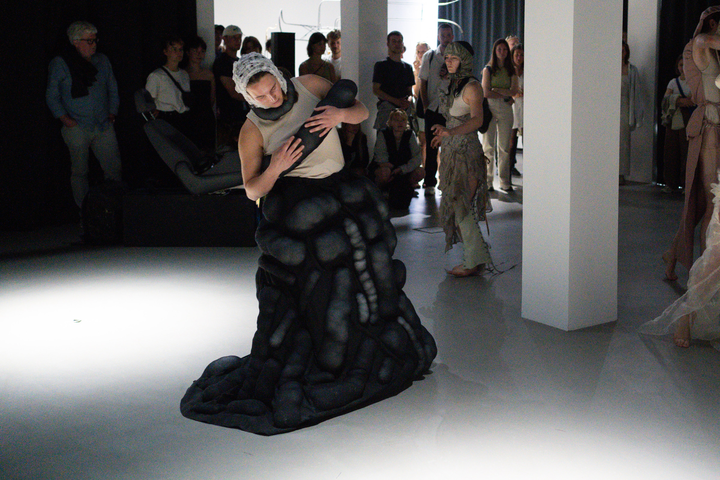 Lea Maginskis Projekt Intrauterin besteht aus vier Kostümen. Es setzt sich mit pränatalen Traumata und dem dabei entstandenen Ohnmachtsgefühl auseinander. Die Kostüme übersetzen vage Erinnerungen und Gefühle, für die nie Worte gefunden werden können, in greif- und fühlbare Objekte. Die visuelle Erscheinung rückt hierbei zunächst in den Hintergrund, von Bedeutung ist die haptische Ebene. Wie fühle ich mich mit den angezogenen Kostümen? Welche möglichen Erinnerungen verbinde ich damit? Für spce | Muthesius werden die skulpturalen Kostüme nun in einer Performance inszeniert, emotional aktiviert und interaktiv erfahrbar.