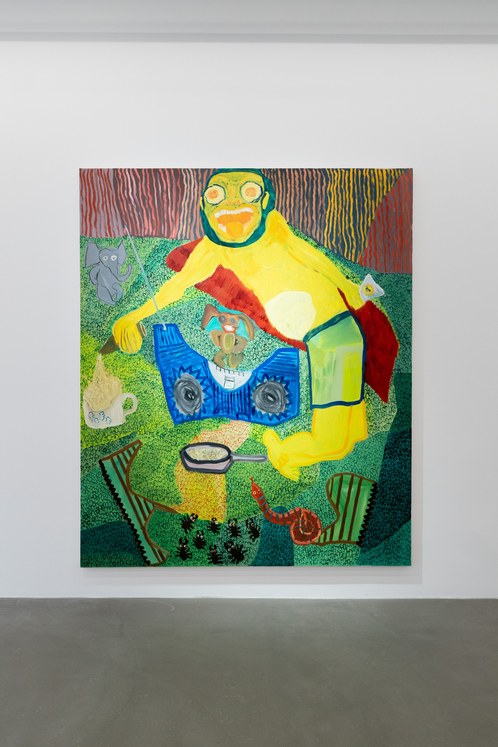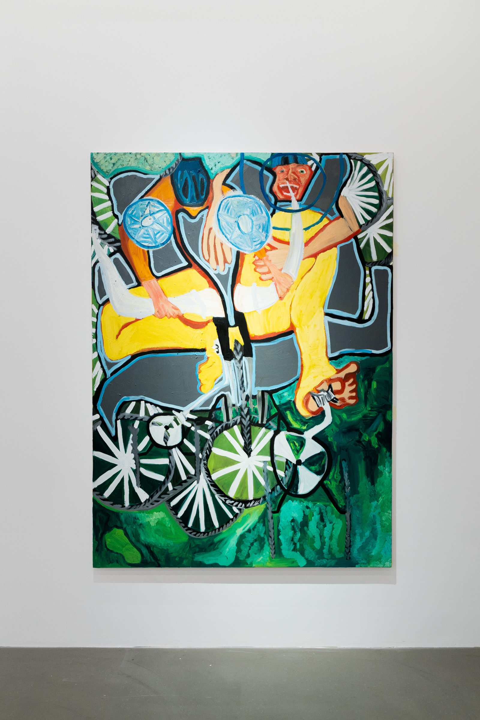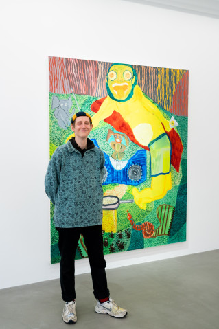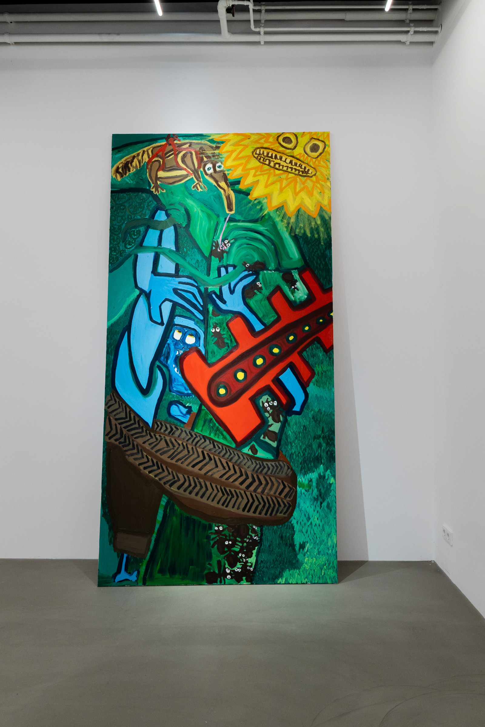 In seinen oft großformatigen Malereien bestechen Leonard Gneuß‘ (*1998, D) Arbeiten durch ihre kräftigen Farben, die er ganz bewusst kontrastierend nebeneinanderlegt. Auffällig ist der radikal ursprüngliche Einsatz, die Betonung der Fläche und der Zweidimensionalität der Leinwand, im starken Kontrast zur Idee von Nachahmung der Realität durch das Zeichnen von Proportionen oder Raumtiefen. Darum geht es in seiner Malerei nicht. Sie dient ihm vielmehr dazu Bildwelten zu erschaffen, die sich visueller Logik und stringenter Narrative entziehen dürfen.