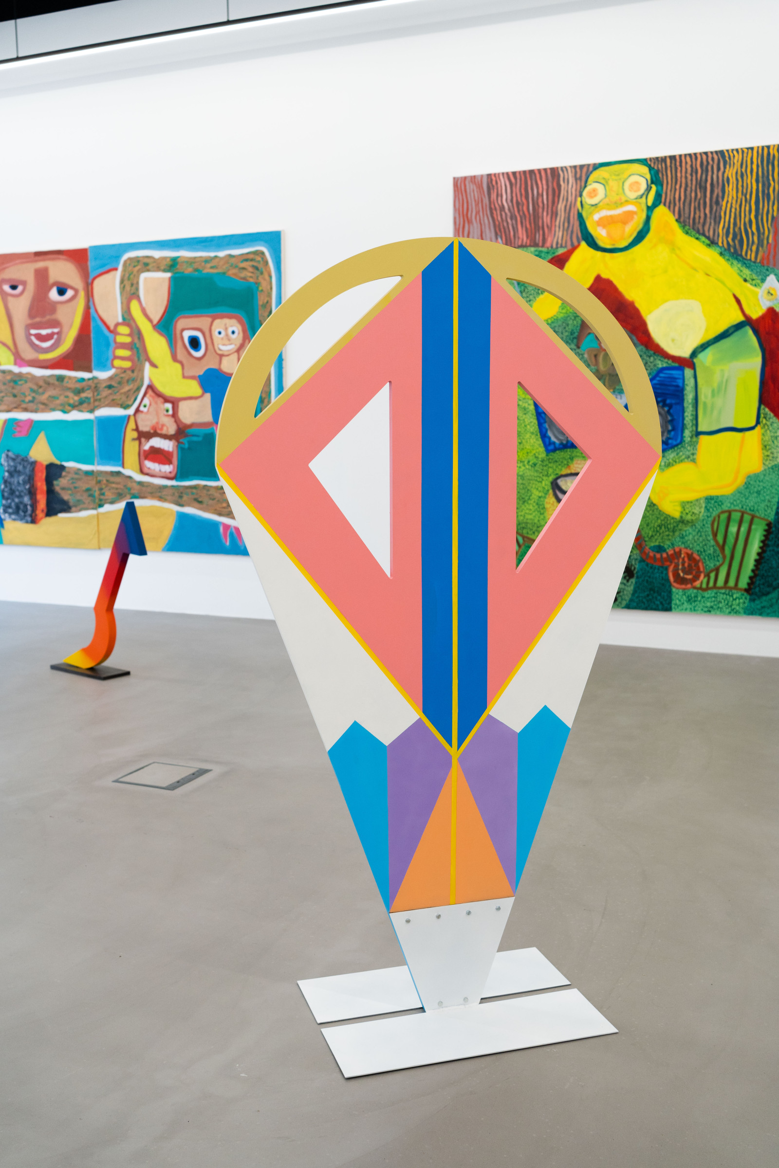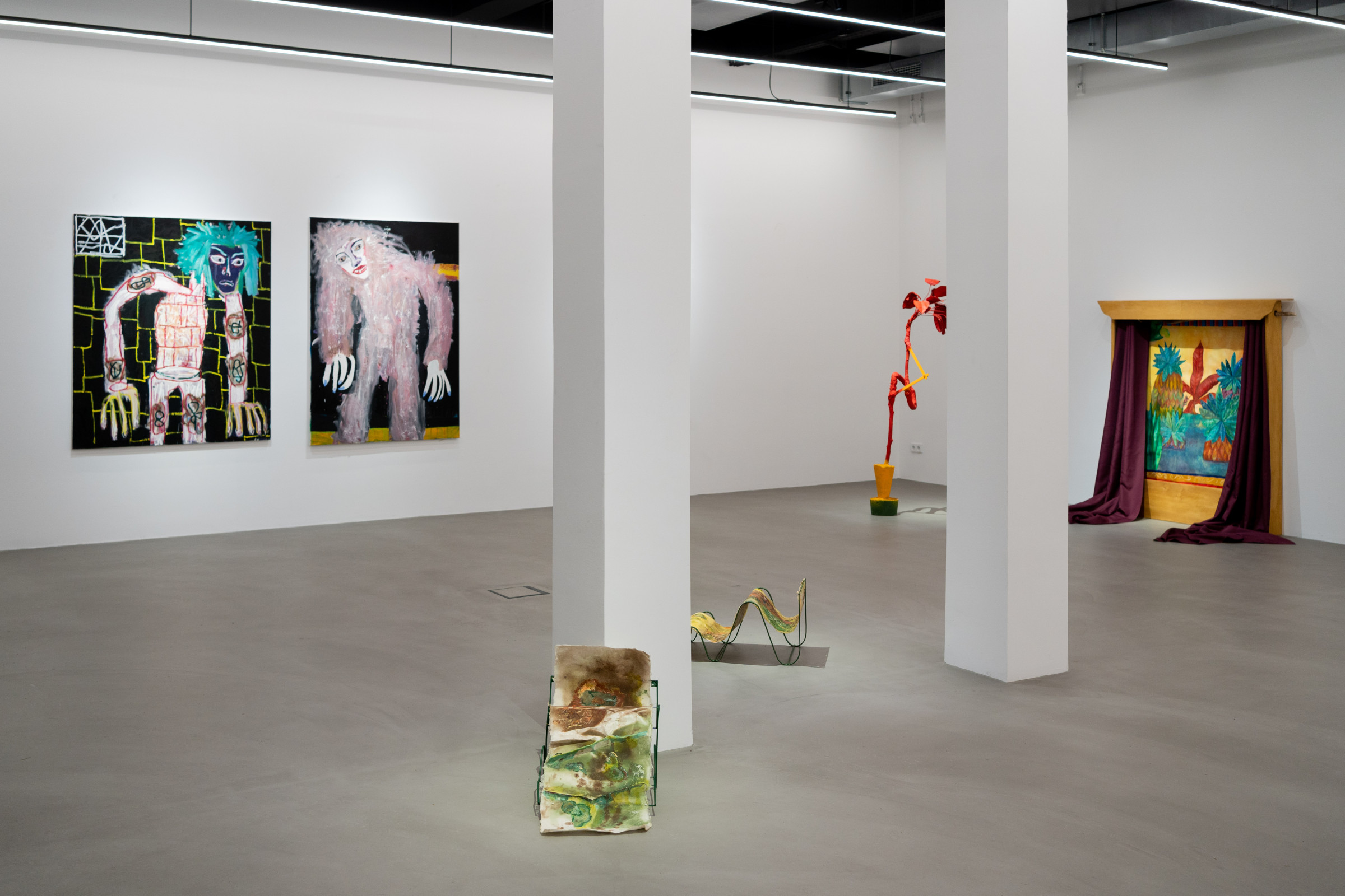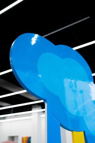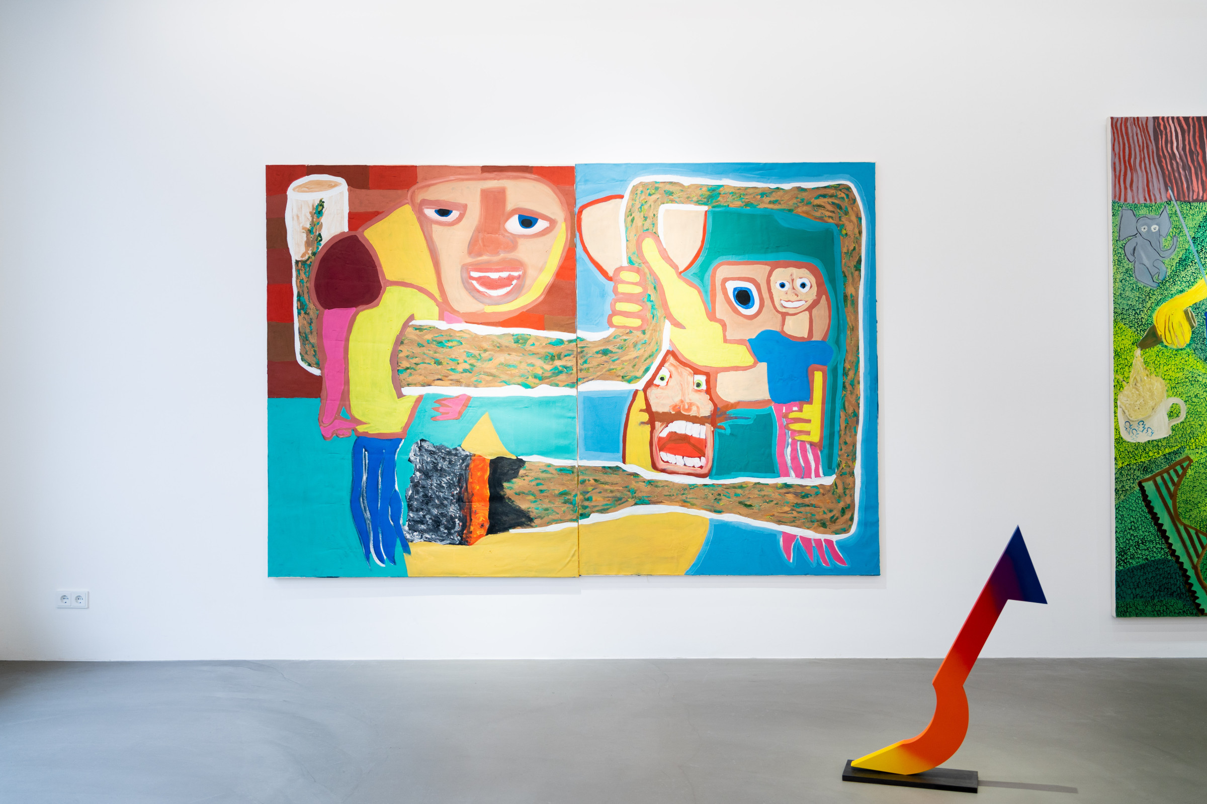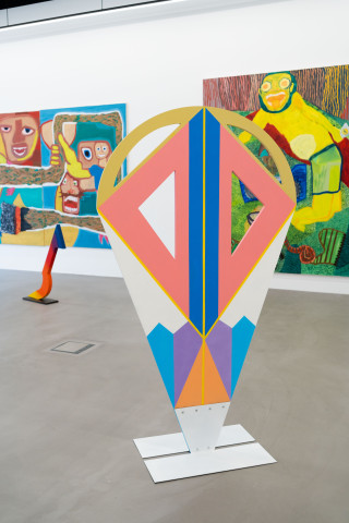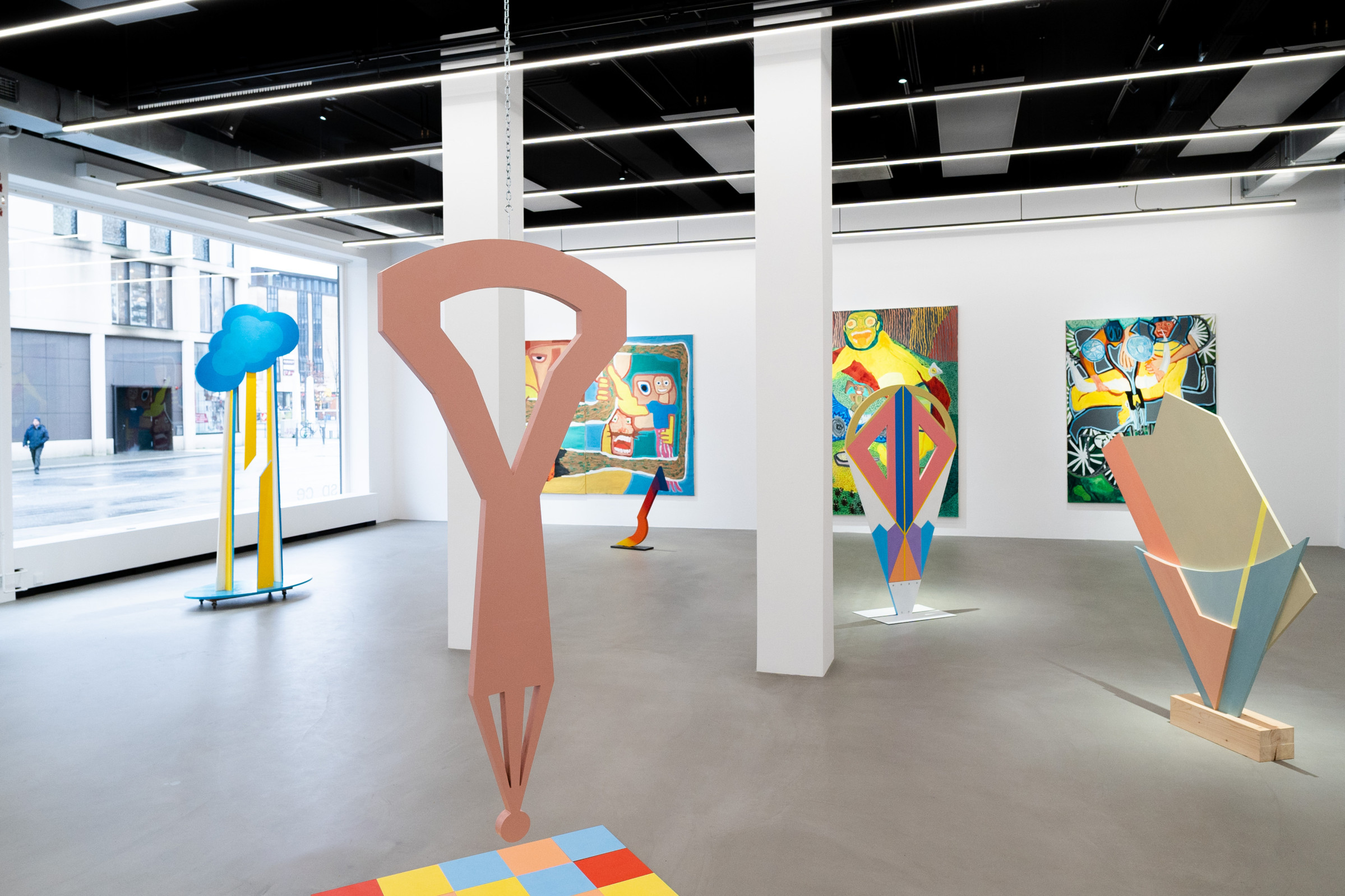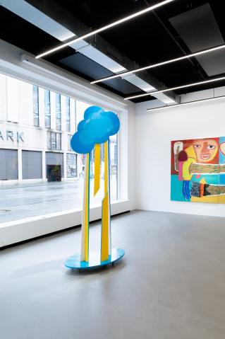 Ana Kostova (*1995, BUL) definiert sich malerisch über geometrische Farbsetzungen und beschränkt sich nicht auf den ureigenen Malgrund, die Leinwand, sondern formuliert diese skulptural aus. Einst zeichnerische Elemente werden dreidimensional, Farben werden zu Charakteren, die sich durch einen Körper auszeichnen, wie man exemplarisch in den Arbeiten The Queen (2022) oder Mycloud (2022) erleben kann. Diese Körper bezeichnet sie als „Fortsetzung ihrer Malerei.“