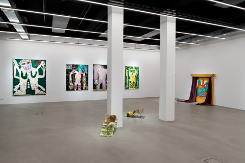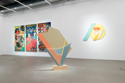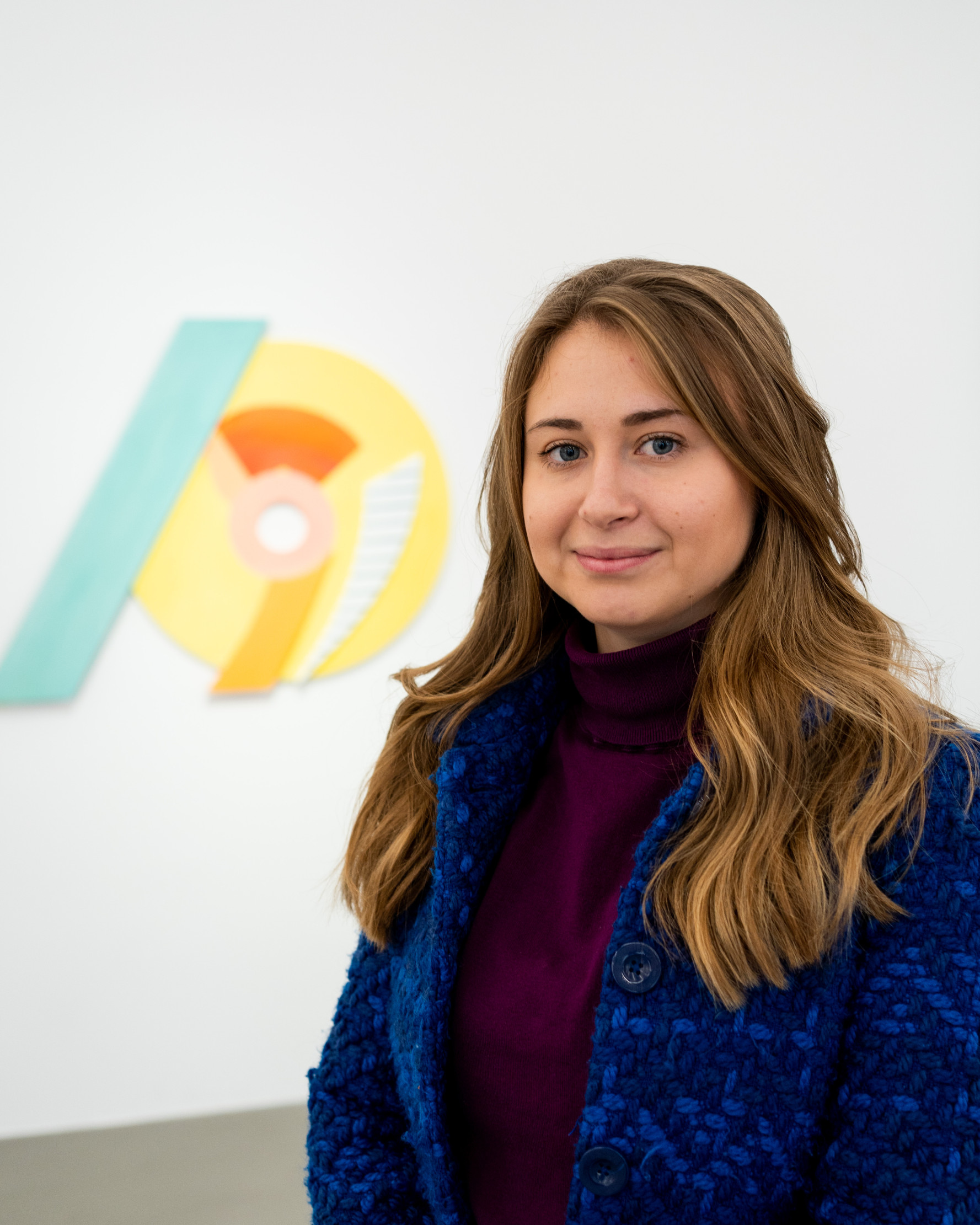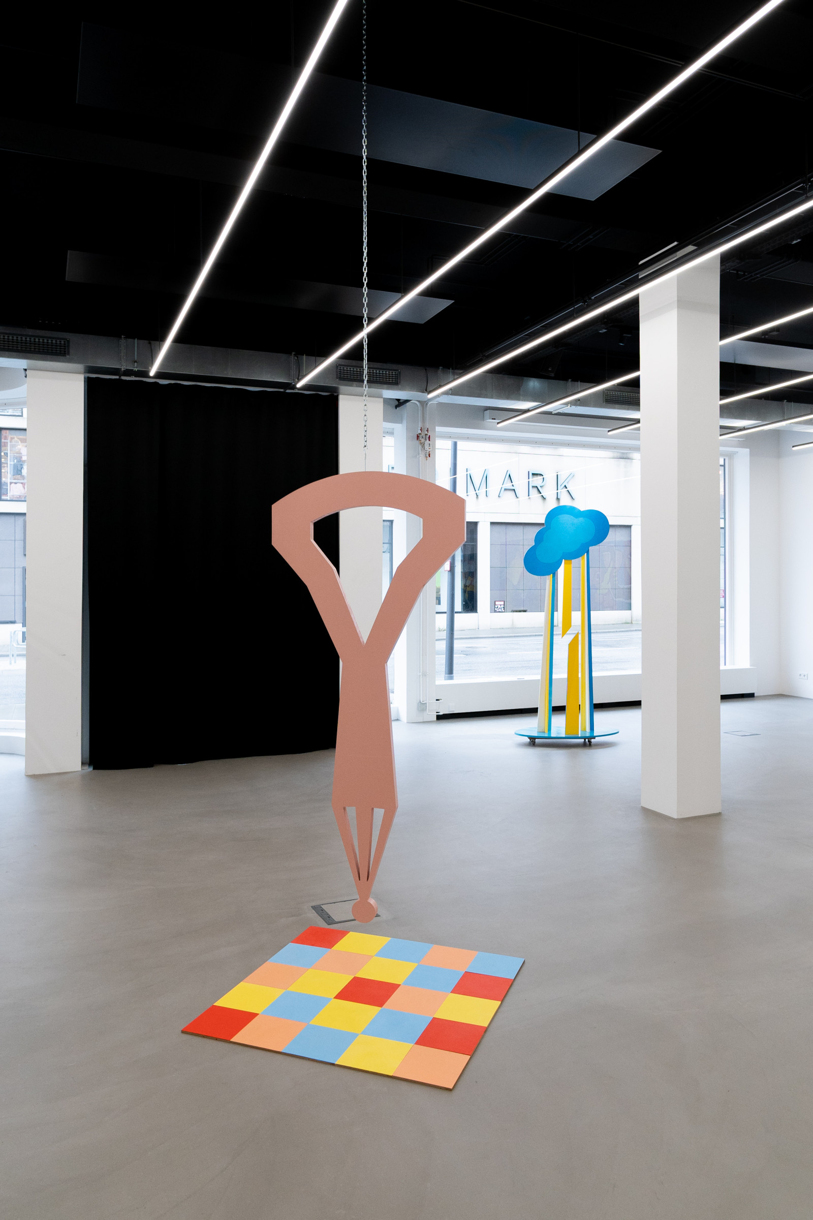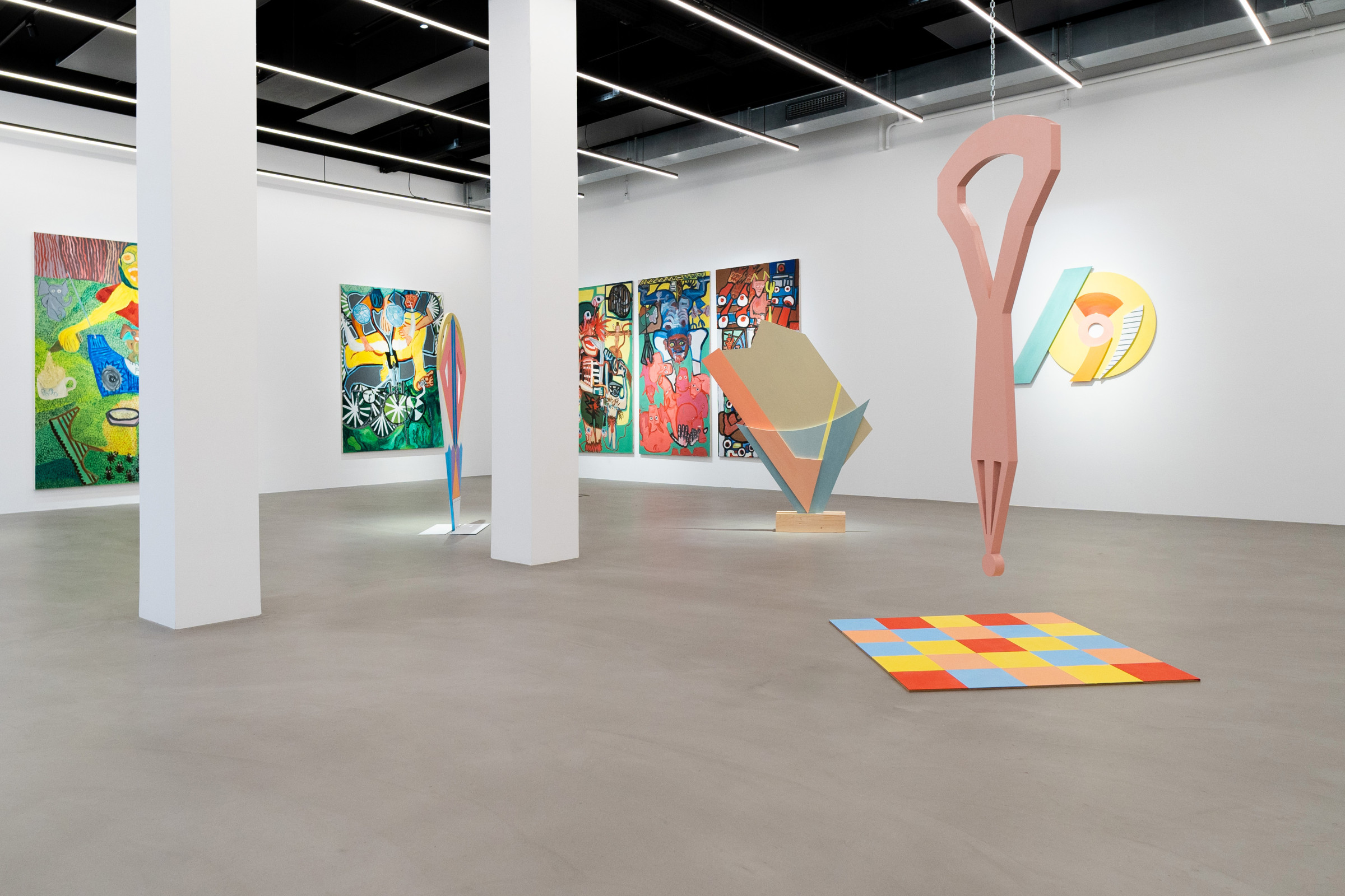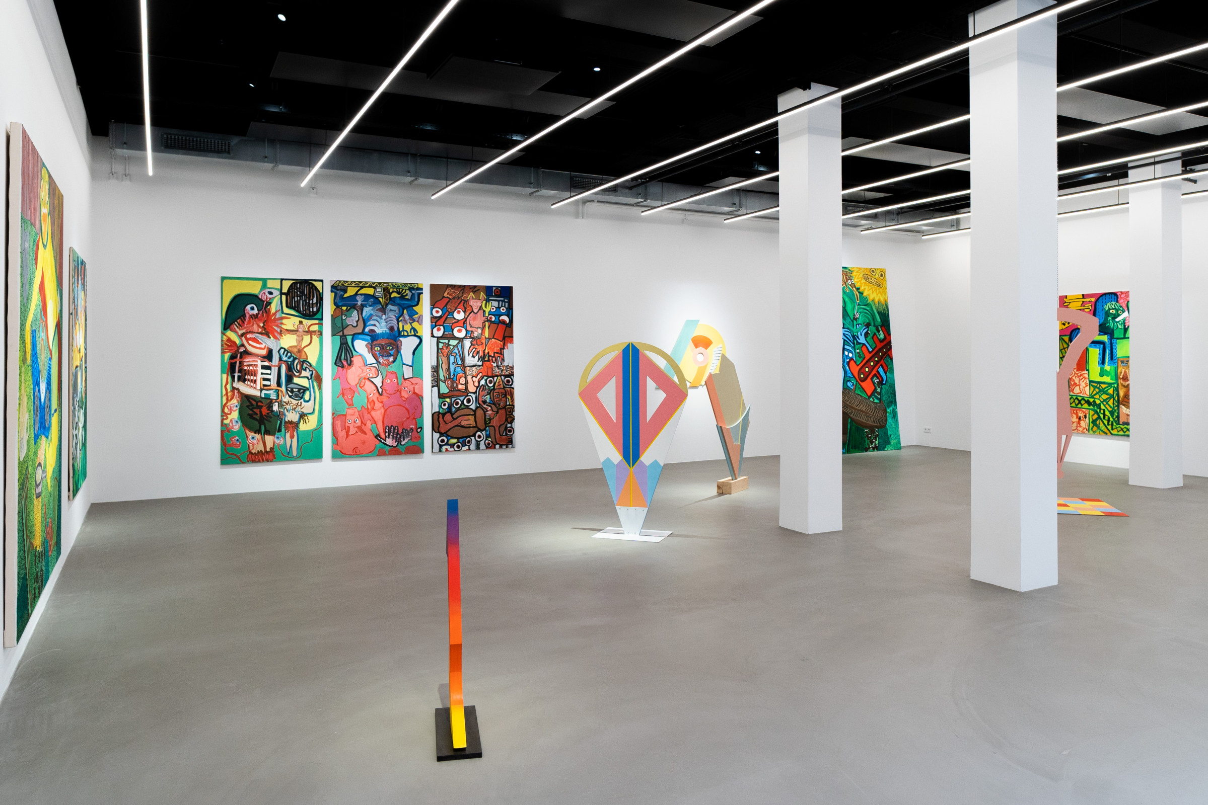 Ana Kostova (*1995, BUL) definiert sich malerisch über geometrische Farbsetzungen und beschränkt sich nicht auf den ureigenen Malgrund, die Leinwand, sondern formuliert diese skulptural aus. Einst zeichnerische Elemente werden dreidimensional, Farben werden zu Charakteren, die sich durch einen Körper auszeichnen, wie man exemplarisch in den Arbeiten The Queen (2022) oder Mycloud (2022) erleben kann. Diese Körper bezeichnet sie als „Fortsetzung ihrer Malerei.“