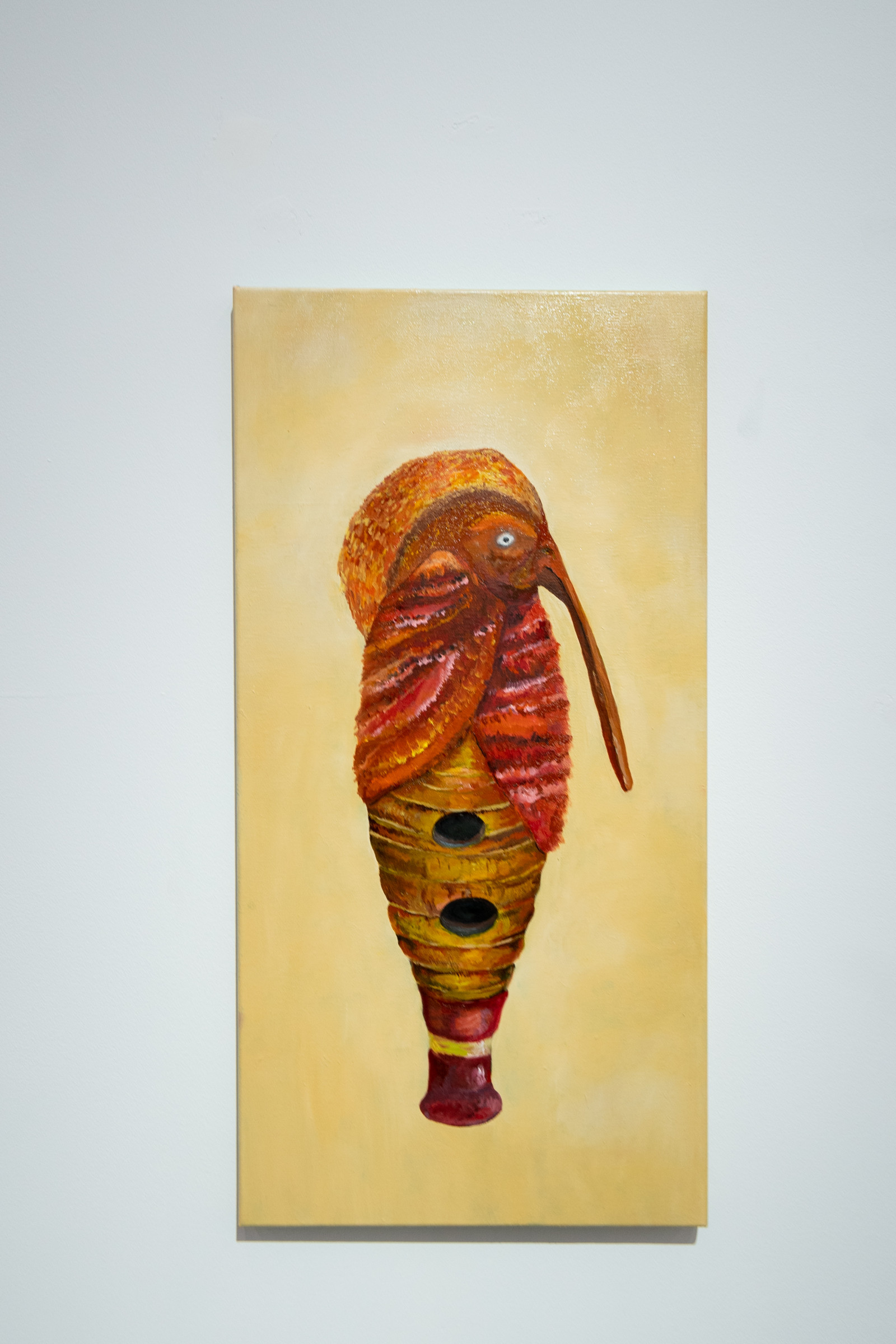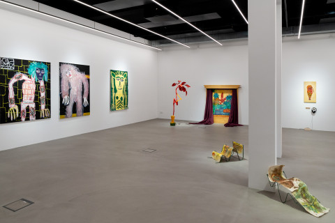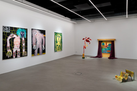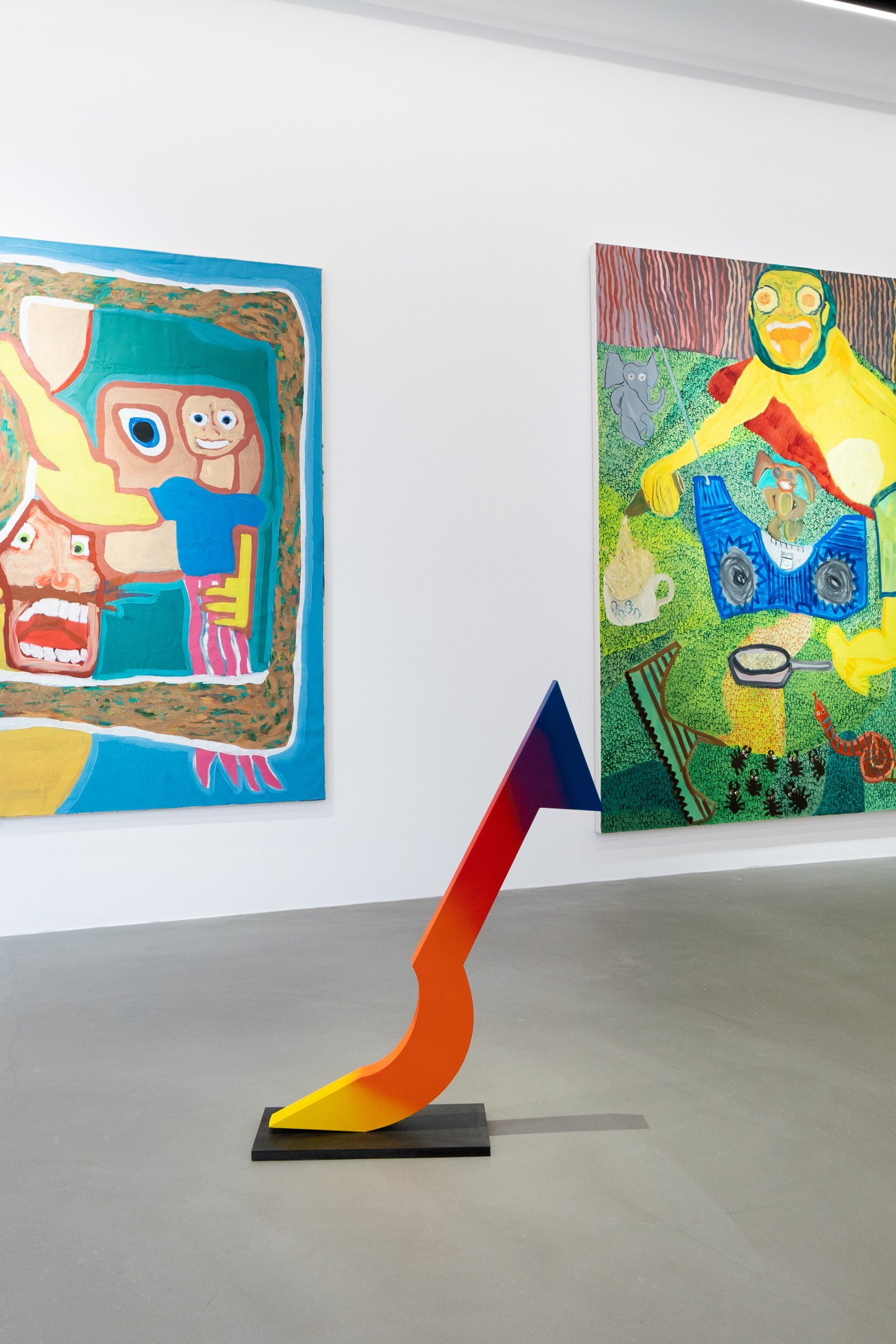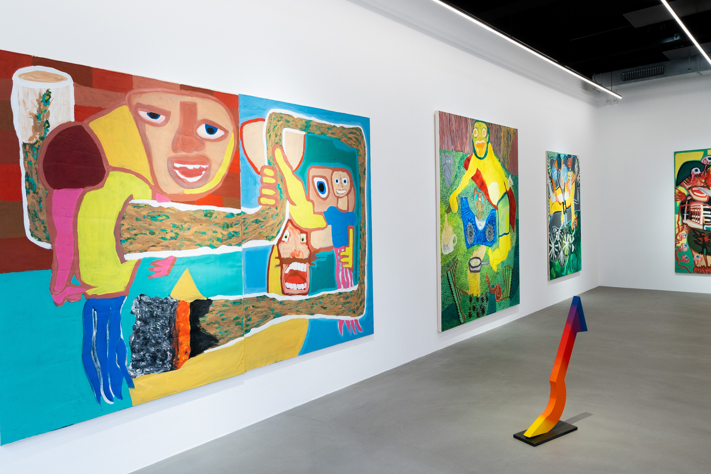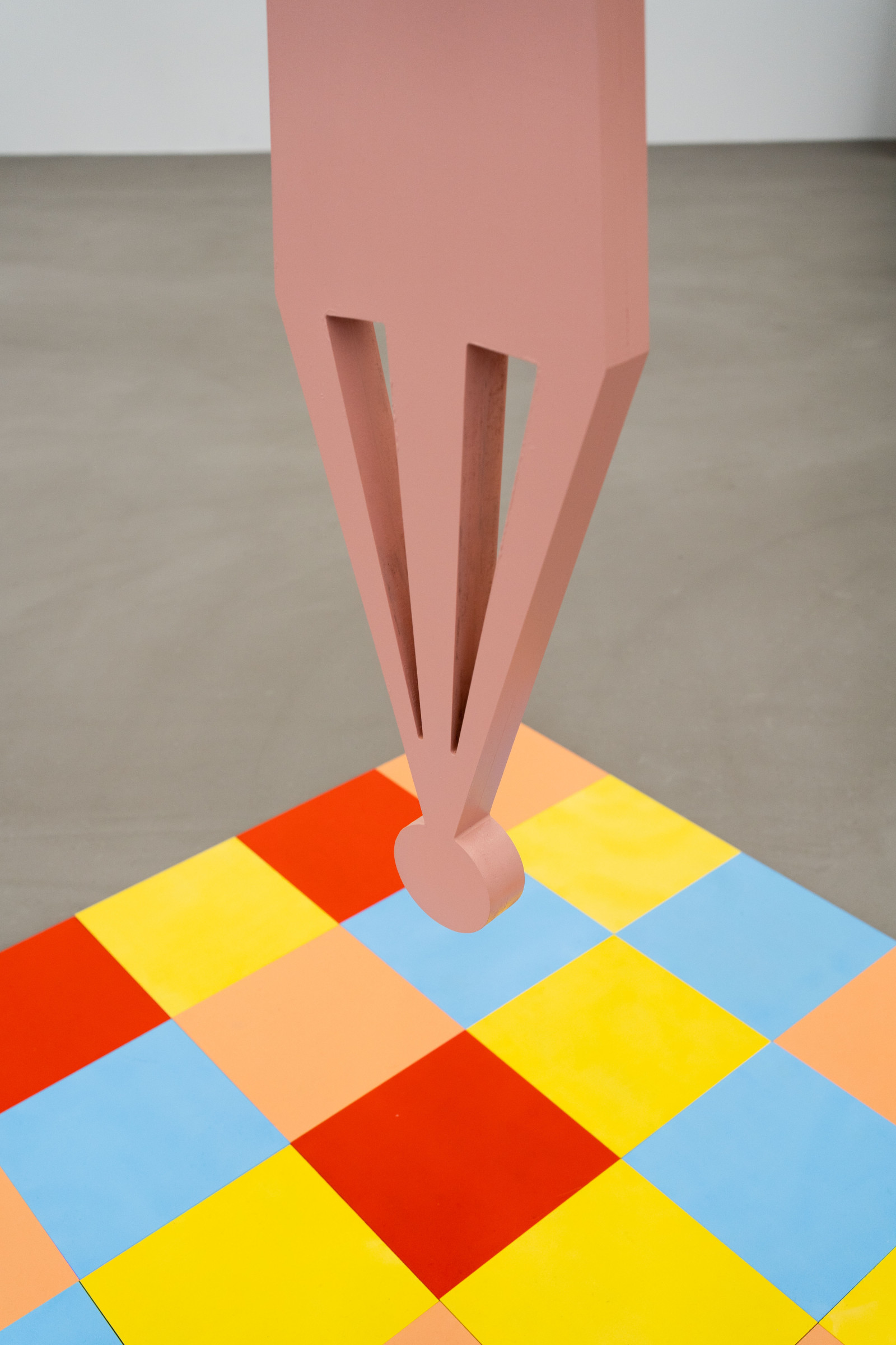 Ana Kostova (*1995, BUL) definiert sich malerisch über geometrische Farbsetzungen und beschränkt sich nicht auf den ureigenen Malgrund, die Leinwand, sondern formuliert diese skulptural aus. Einst zeichnerische Elemente werden dreidimensional, Farben werden zu Charakteren, die sich durch einen Körper auszeichnen, wie man exemplarisch in den Arbeiten The Queen (2022) oder Mycloud (2022) erleben kann. Diese Körper bezeichnet sie als „Fortsetzung ihrer Malerei.“