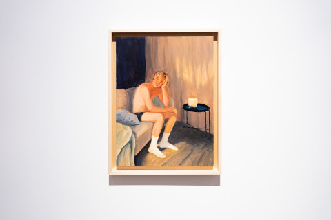 Janna Schnoor (*2000, D) studiert in der Klasse Malerei von Professorin Antje Majewski. Ihre Malereien basieren auf genauen Beobachtungen alltäglicher Momente und sind grob umrissen der malerischen Tradition nach dem Streben um Nachahmung von Realität verbunden. Der Weg zum Bildmotiv erfolgt klassisch über Skizzen, Zeichnungen, Studien, wobei durchaus Bildelemente von verschiedenen erlebten Situationen entnommen werden und zu einem so nie dagewesenen Ganzen komponiert werden (Hideaway, 2022).