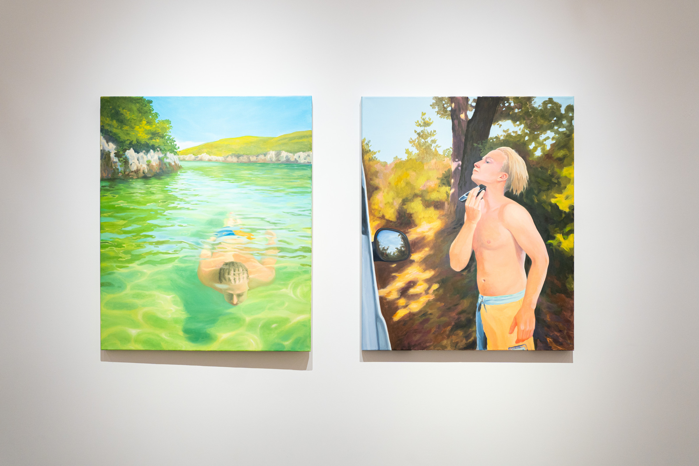 In Malereien wie Ausgewöhnen (2021), Morgenbad (2022) und Von mir zu dir (2021) werden menschliche Beziehungen, werden Berührungen und Körperlichkeit sinnlich thematisiert. Der Partner als Objekt der Begierde und des Interesses wird in den Blick genommen und auf die Leinwand übertragen, der Betrachter zum Zeugen intimer Momente. Eine gängige Bildsprache der Kunstgeschichte – der weibliche Körper dem männlichen Blick preisgegeben – wird hier ironisch konterkariert.