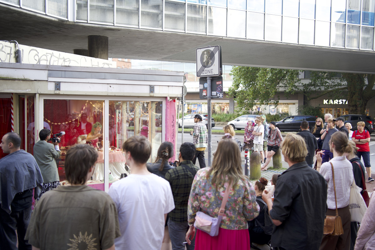 The artist exhibits herself as part of the room: Using performances resulting from the spatial installation, she creates connections between the passers-by and the world behind the window glass.