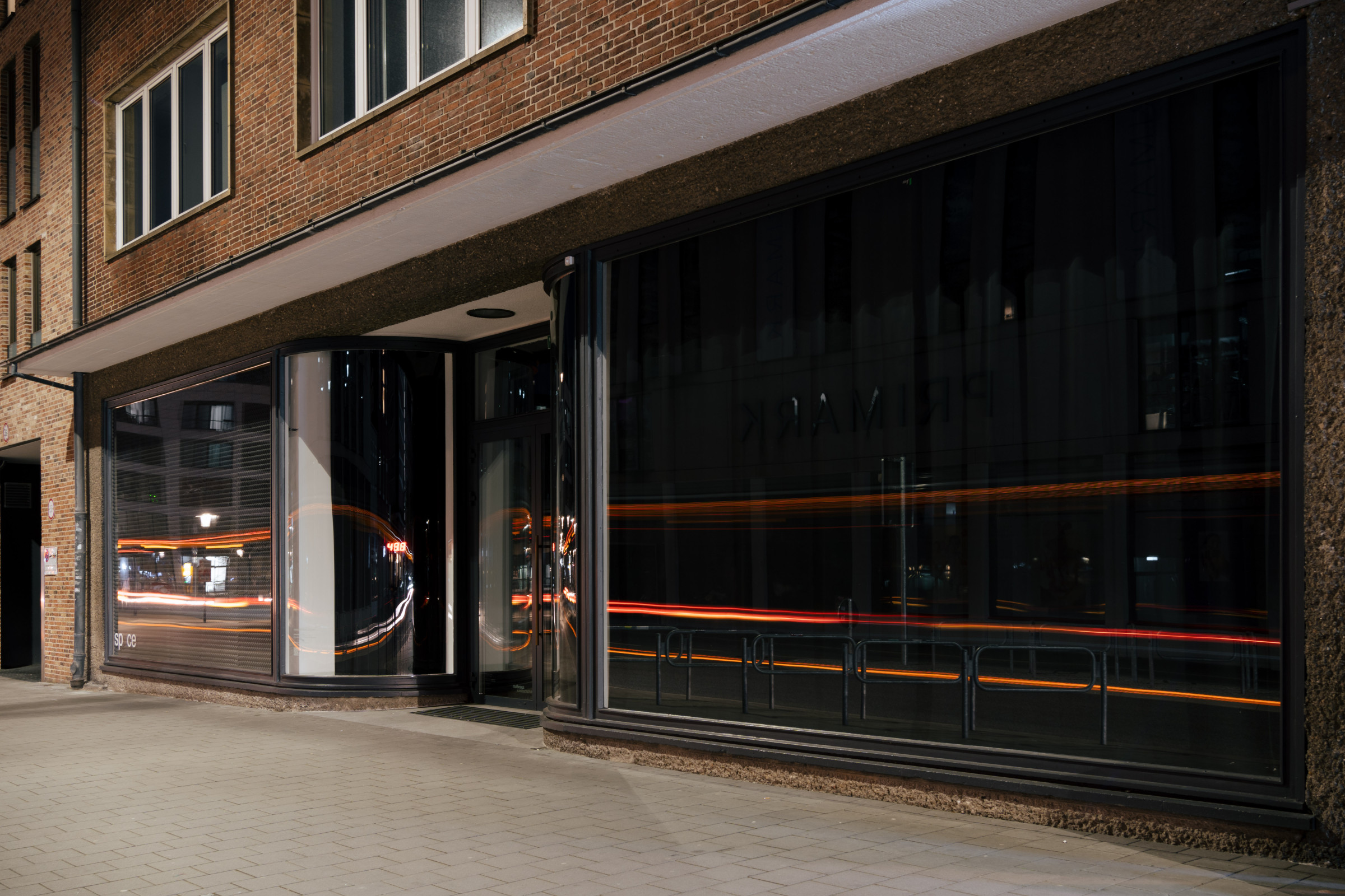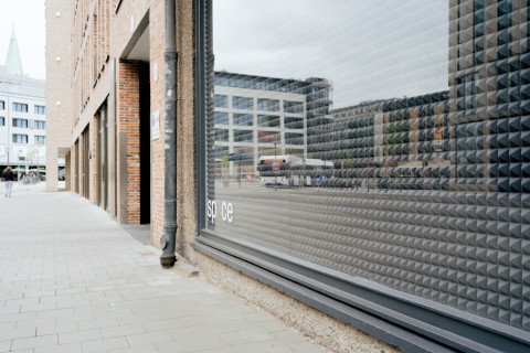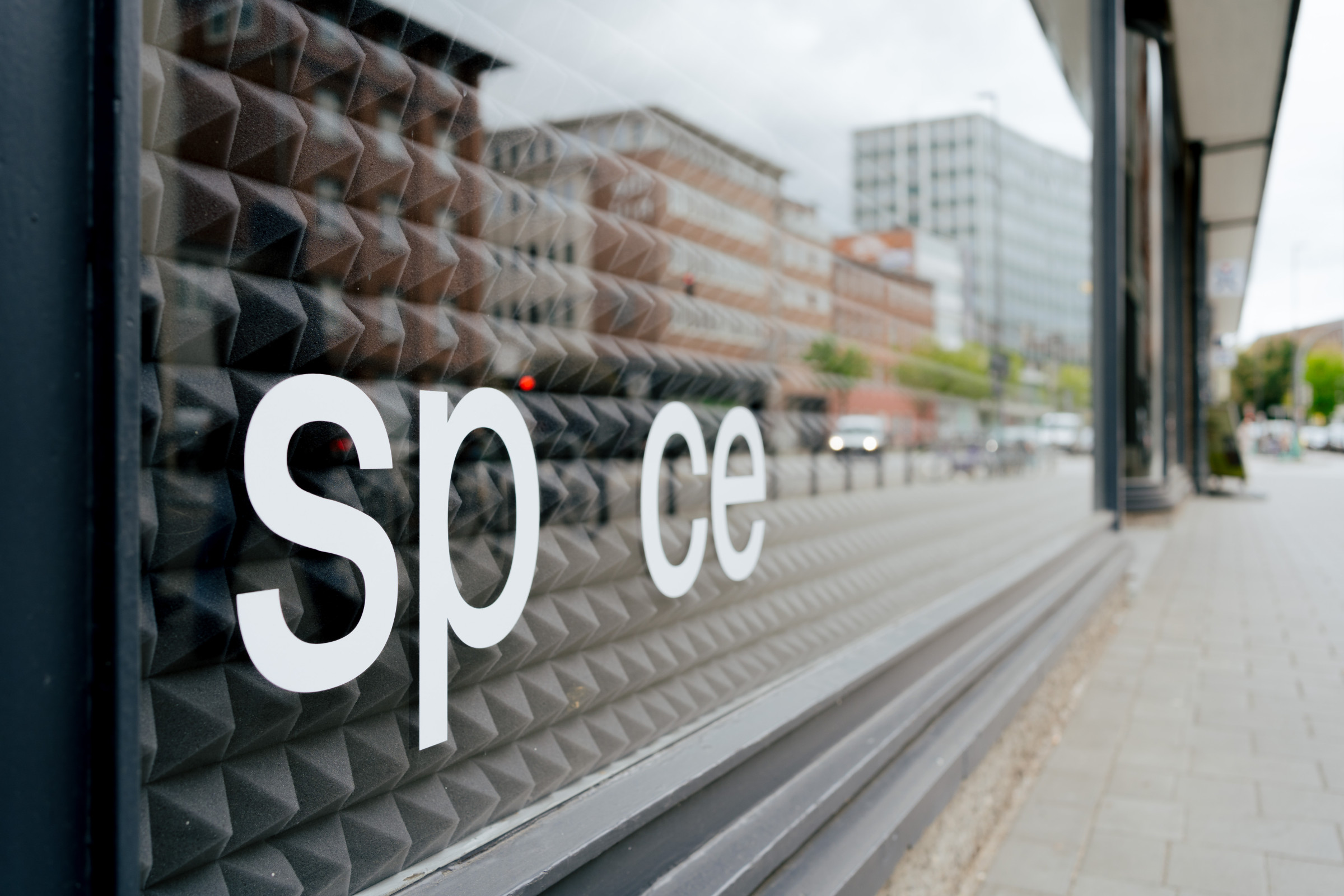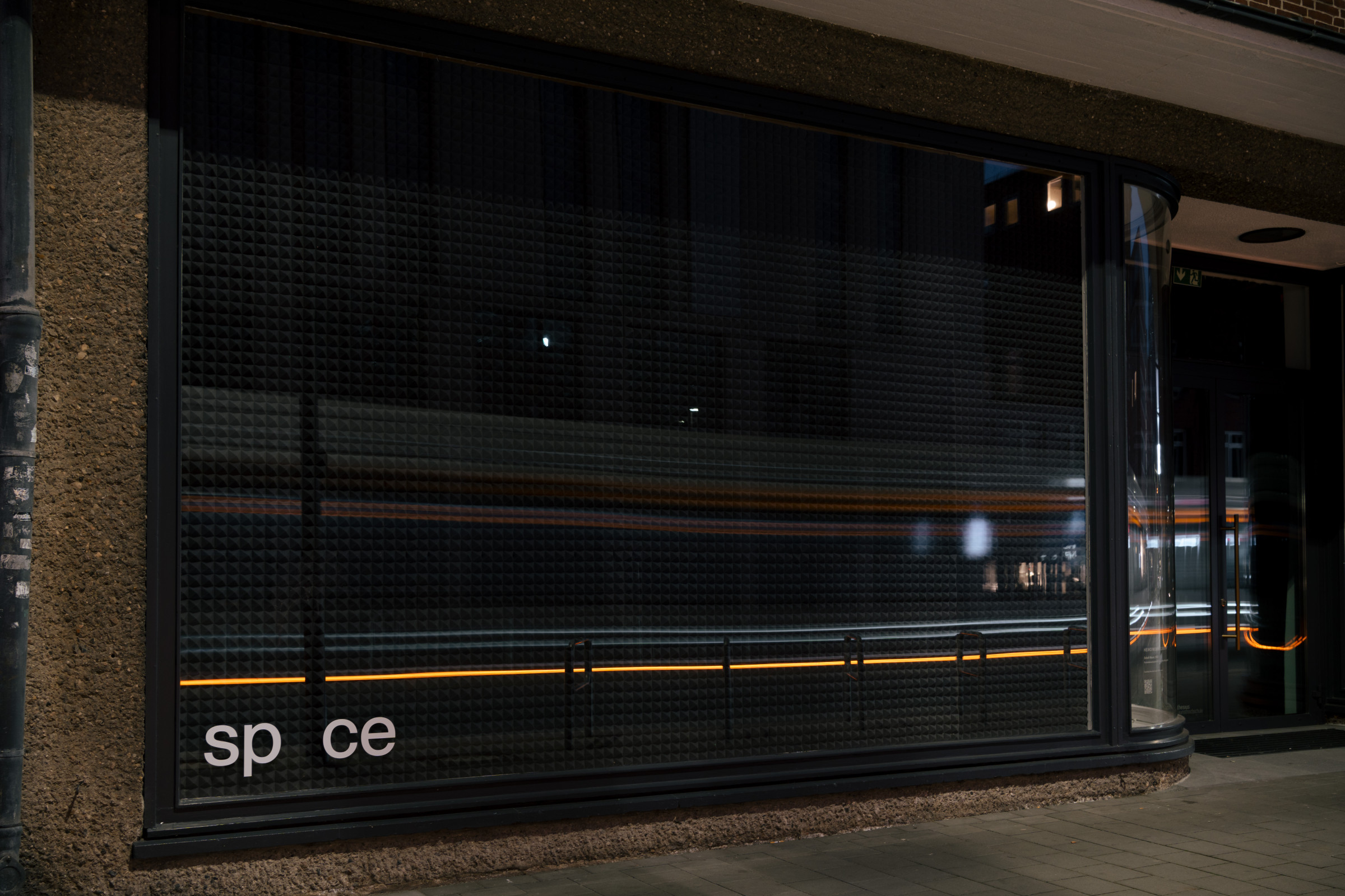 52The left window front of spce | Muthesius is lined with acoustic insulation panels. Originally intended as hearing protection, the insulating panels now become a pattern in their own right, a rhythm of black foam pyramids.