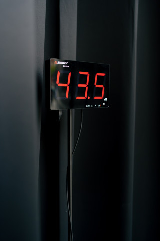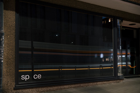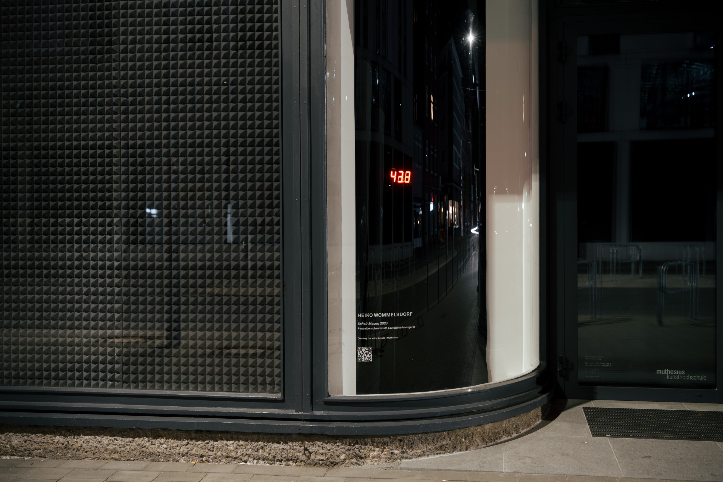 Passers-by become part of the installation with their noises, as does the street noise that penetrates the room through the windows, and what is happening in the room. Although you can't see the inside, you can see its effect on the volume level. A passing bus enriches the composition of urban background noise with a bass line, while the noise of the ventilation systems transforms the staging of architectural material noise into a kind of drone music.