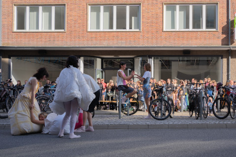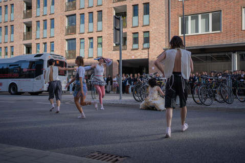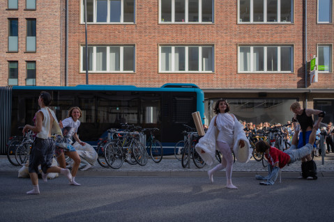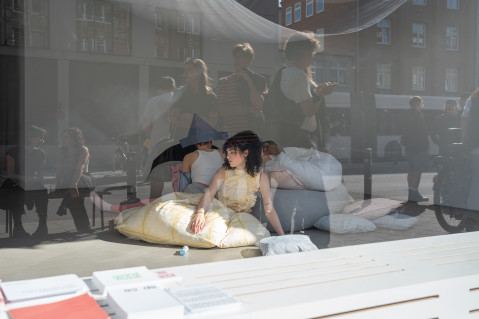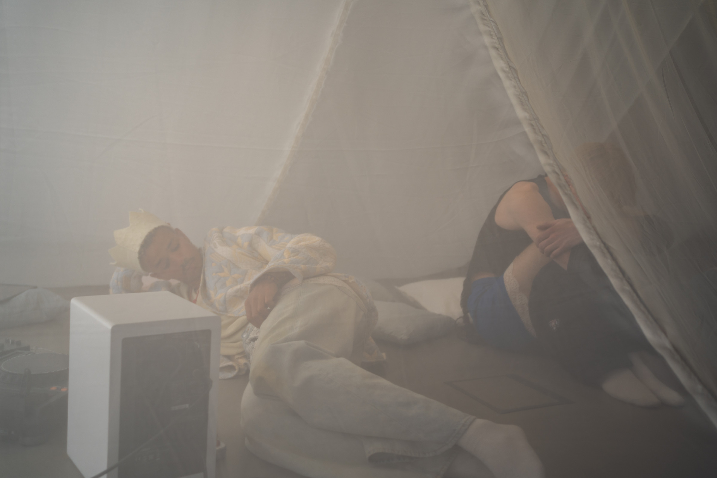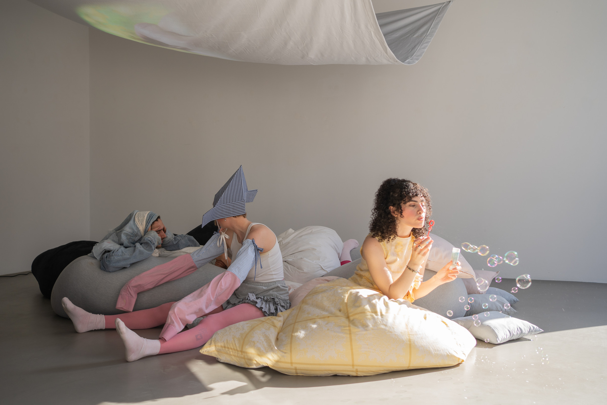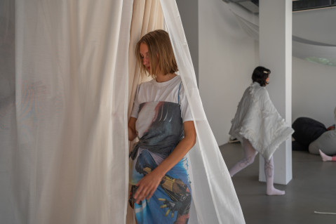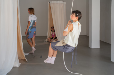 Lea Maginski and Paul Dorobisz present their clothes with a performance that goes beyond the sp ce | Muthesius. Through the collaboration of Jesse Jacobsen's interior design and Luisa Luka's harmonious sound composition, the bodies are given a space of comfort that creates a familiar home.