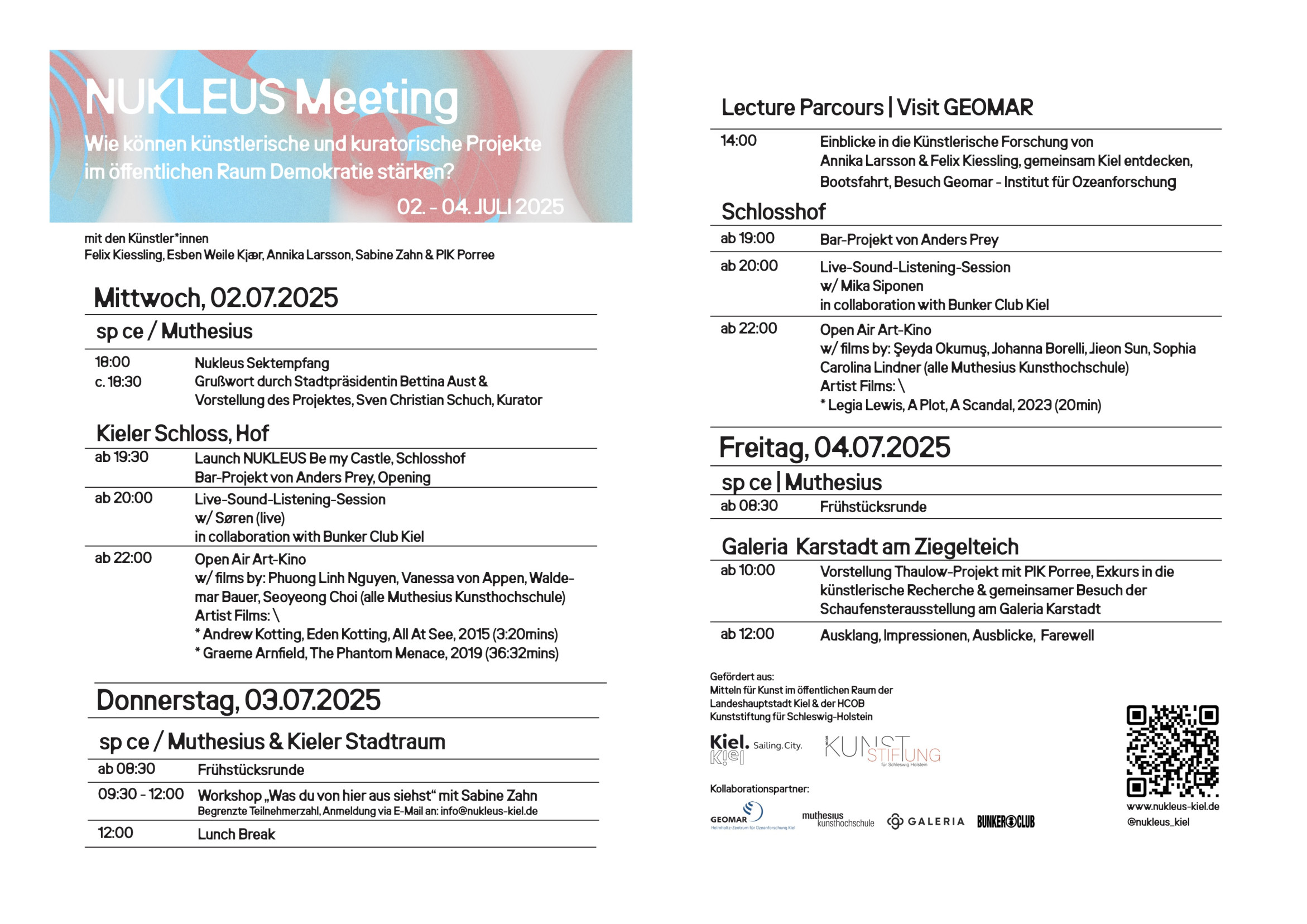 NUKLEUS Kiel ist ein interdisziplinäres Kunstprojekt, das den Stadtraum Kiels als Forschungsfeld versteht. Internationale Künstler*innen und lokale Studierende der Muthesius Kunsthochschule arbeiten über mehrere Monate hinweg an künstlerischen Interventionen, die Fragen nach urbaner Teilhabe, öffentlichem Raum und demokratischem Miteinander aufwerfen.